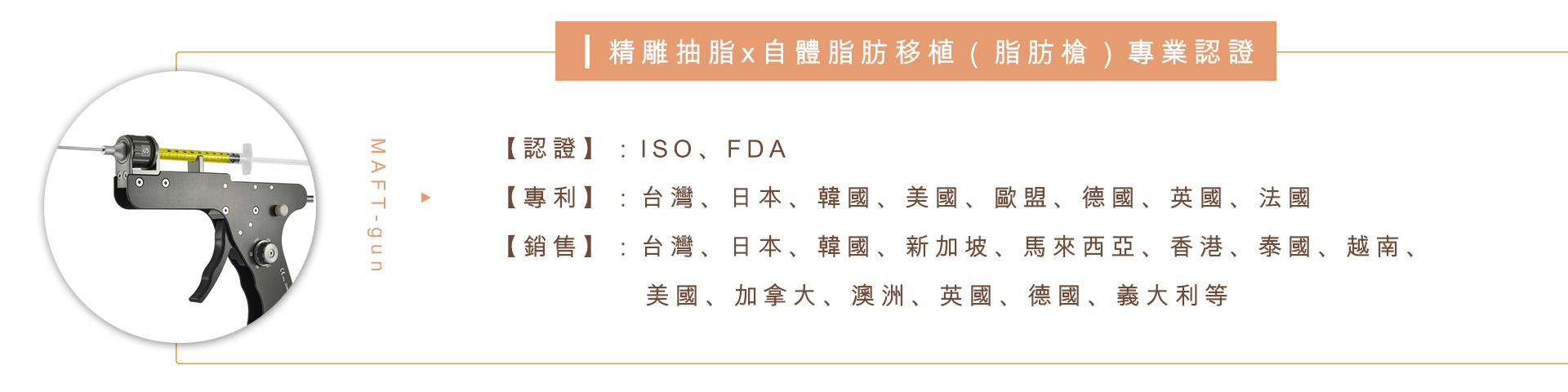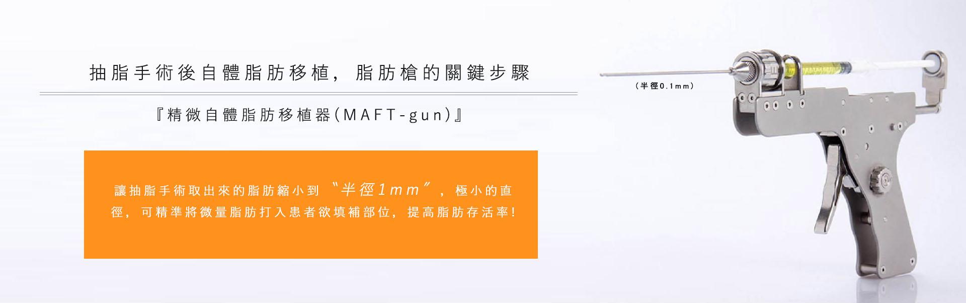 大眾俗稱的脂肪槍又稱為『精微自體脂肪移植器(MAFT-gun)』,它可以讓抽脂手術取出來的脂肪縮小到〝半徑1mm〞,極小的直徑,可精準將微量脂肪打入患者欲填補部位,提高脂肪存活率高到七成,更能大幅降低併發症風險,是手術中關鍵的一環。