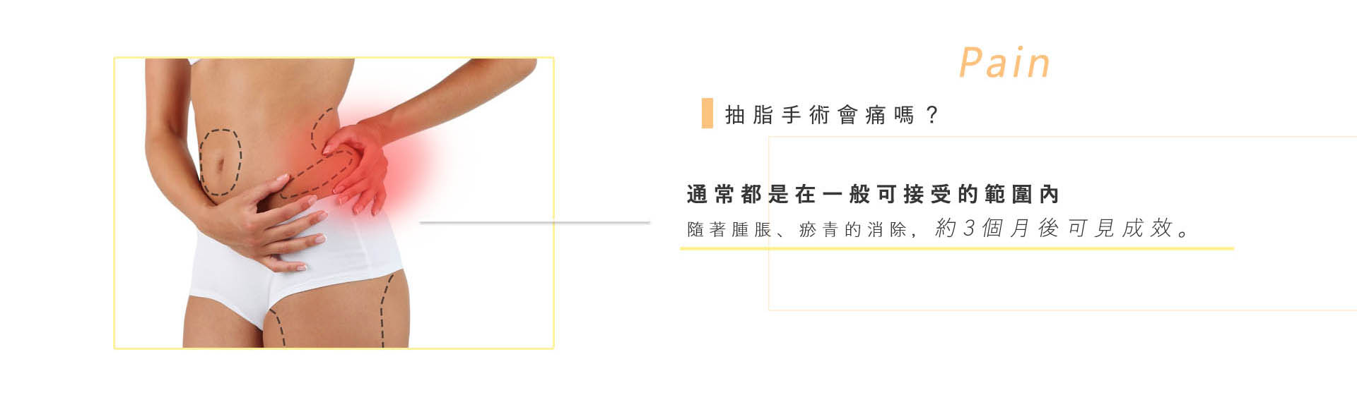 抽脂手術主要在脂肪層中進行,脂肪層中的痛覺神經分布相當少,所以不太會感覺到疼痛,術後疼痛也是相當輕微的,只有些微腫脹及麻木感,通常都是在一般可接受的範圍內,隨著腫脹、瘀青的消除,約3個月後可見成效,因此也不用過於擔心術後疼痛的問題。