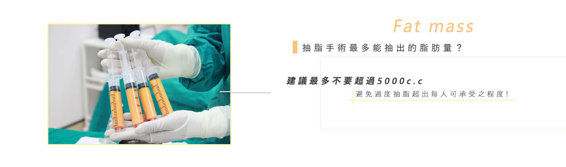 一般來說,一次抽脂手術建議最多不要超過5000c.c,因為過度抽取容易造成身體水分及血液的大量流失,必須適度並遵循專業醫師的評估,避免過度抽脂超出每人可承受之程度,不要陷入抽越多脂肪效果越好的迷思。