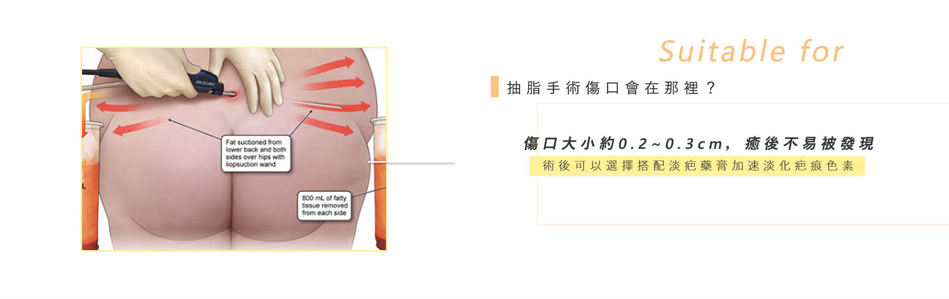 手術部分,一般大約在其抽取部位劃約0.3-0.5公分以內的小切口,利用脂肪手術精密儀器進行抽取,術後使身材外型達到雕塑,有效處理這些頑固脂肪!