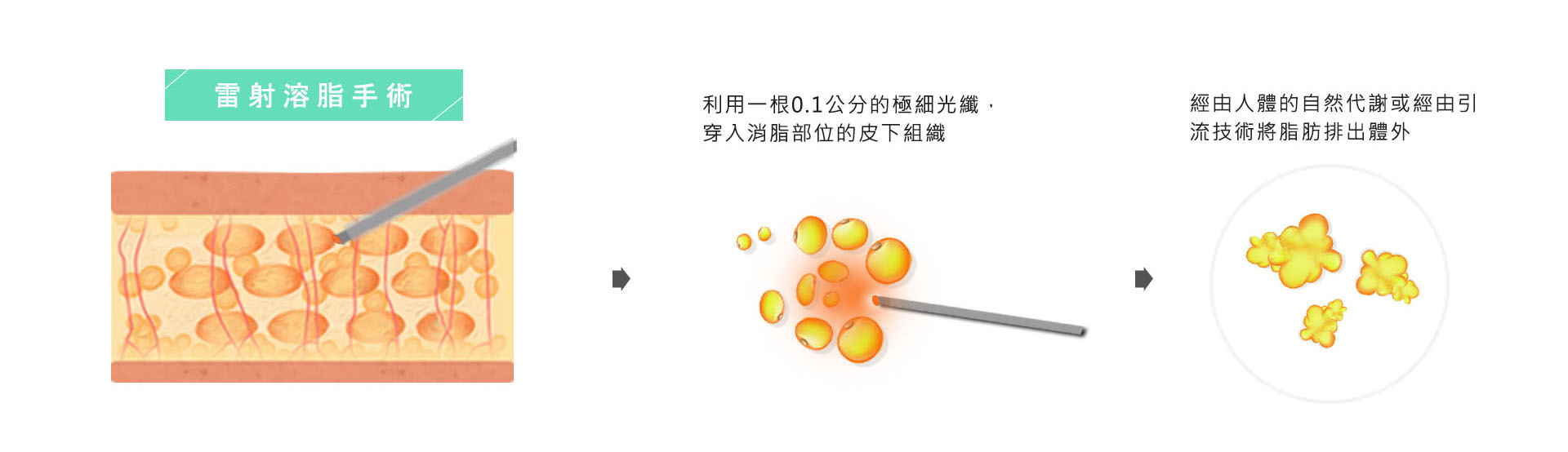 是利用雷射技術,將0.1CM的雷射光纖探針深入皮下脂肪層後,藉由雷射的震波震碎溶解脂肪細胞的細胞膜,以減少脂肪的數量,術後可經由人體的自然代謝或經由引流技術將脂肪排出體外,又因雷射光熱的作用,激發膠原蛋白的再生,術後可提升皮膚的緊實度,因雷射光纖的探頭小,可針對局部或細小部位溶脂。