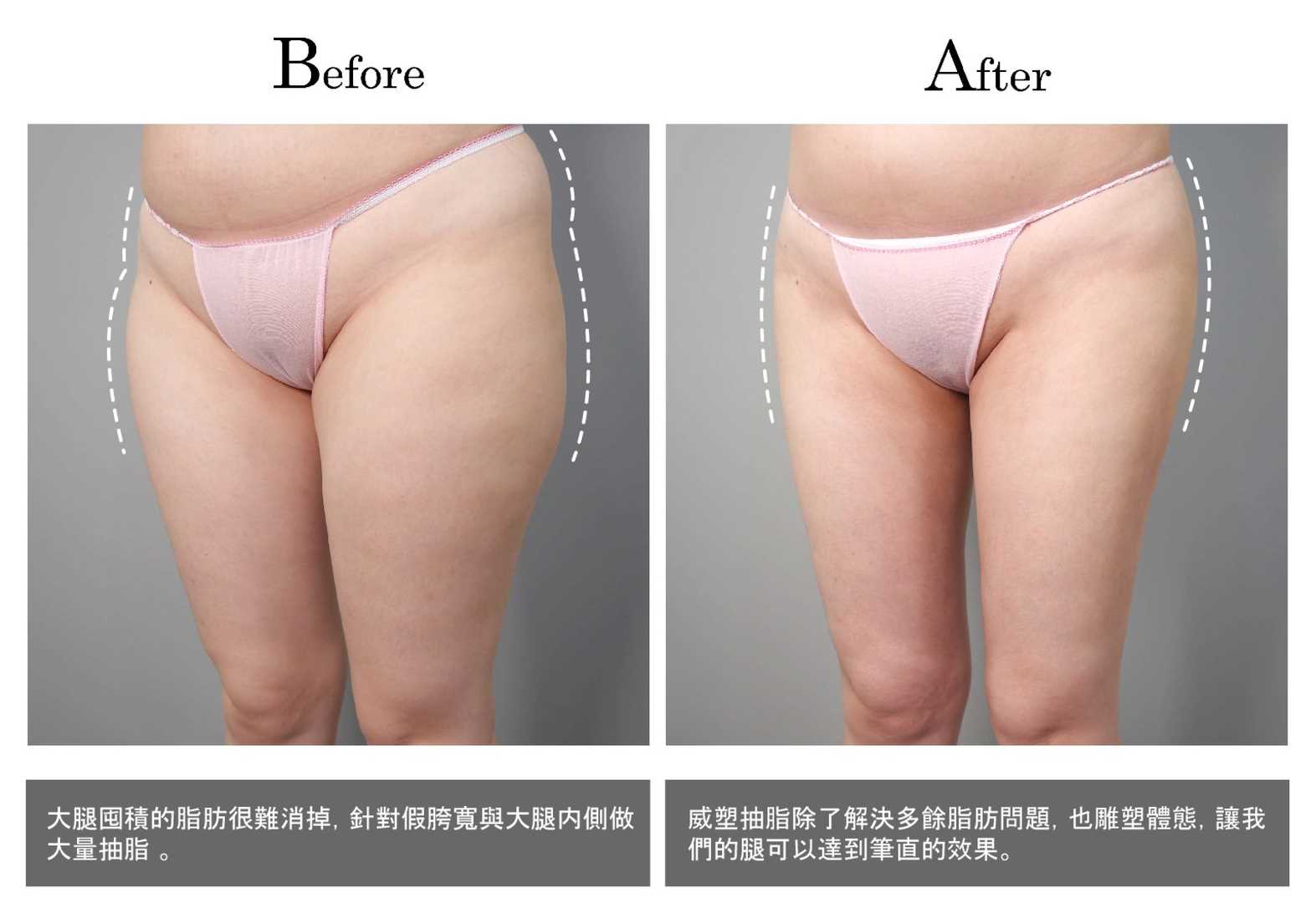 大腿抽脂是透過抽脂方式將囤積在大腿內側、外側、前側、後側的脂肪抽取出來,改善大腿因脂肪推積造成的肥胖問題。