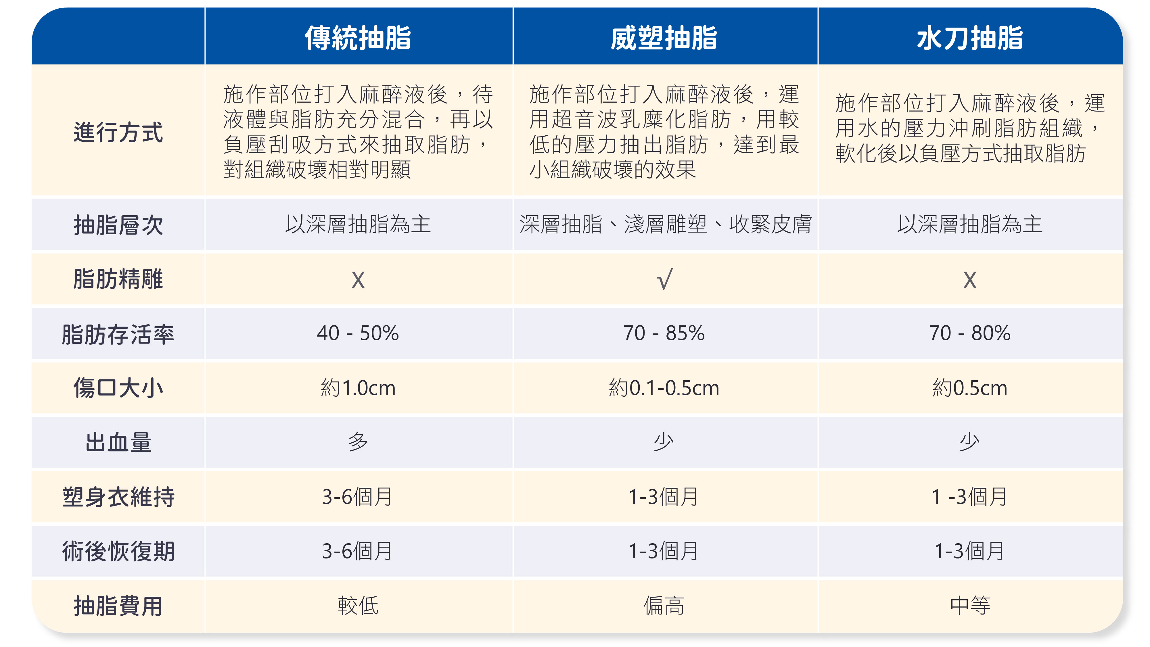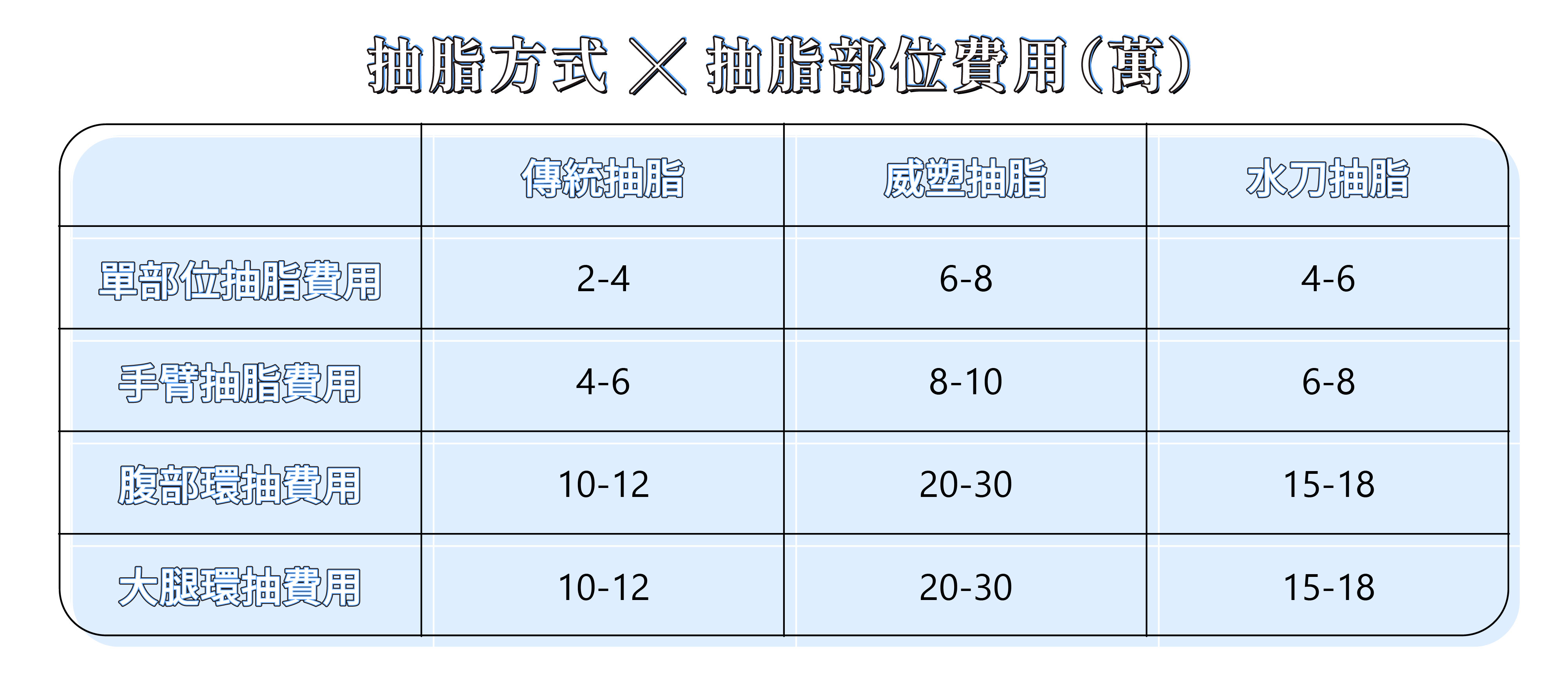 以傳統抽脂、威塑抽脂及水刀抽脂來說明抽脂價格範圍,而不同的抽脂部位可以依據手術難易度,醫師會進一步評估適合的手術方式。