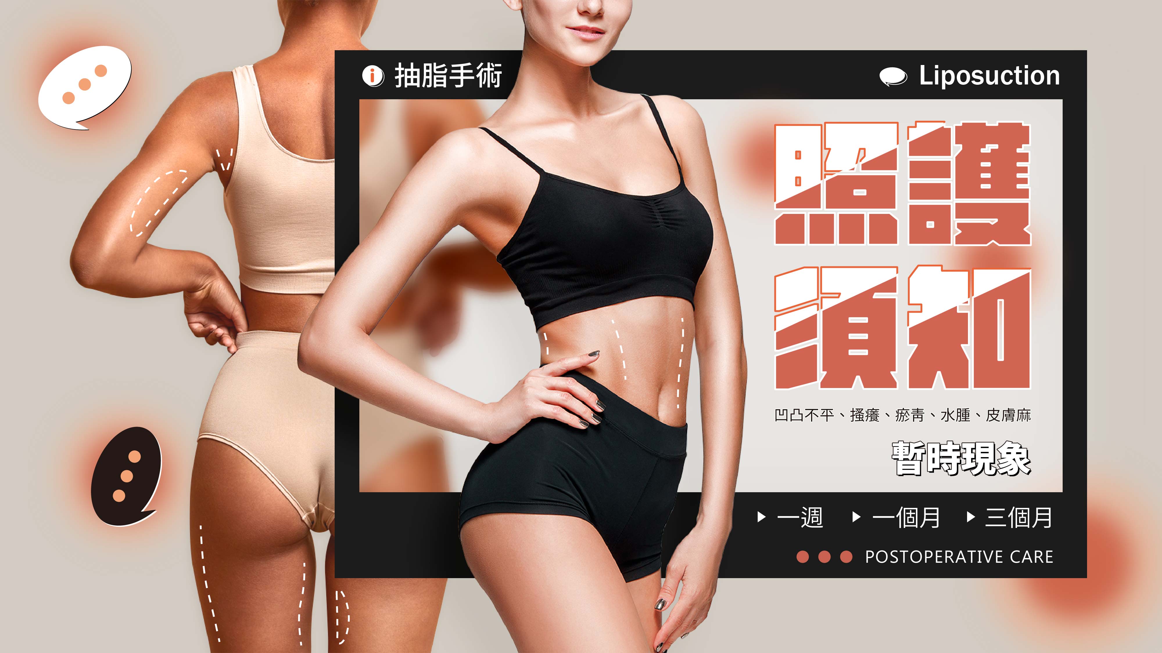 手術後三天必須23-24小時穿著塑身衣,可於第4天後放鬆壓迫力道,隨著手術部位的恢復,須視情況修改塑身衣以保持塑身衣之最佳壓力。術後1週須回診拆線、換藥,手術部位在恢復期間會有小部分的凹凸不平、搔癢、瘀青、水腫、皮膚麻木等現象,1-3個月會逐漸恢復。下腹部抽脂男性陰囊及女生會陰部可能會發生水腫皆為正常現象請不必擔心。