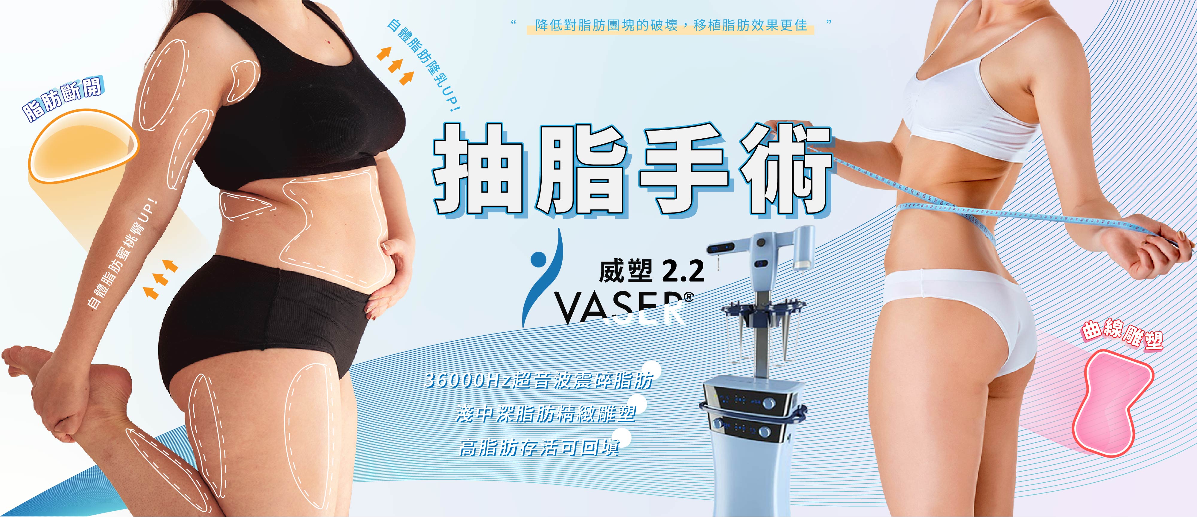 抽脂手術分為哪幾類?手術進行方式為何?;傳統抽脂手術;水刀抽脂手術;Vaser威塑UltraZ抽脂手術;抽脂手術風險後遺症副作用;抽脂手術市場行情;抽脂手術術前術後須知;抽脂手術問題線上解惑;抽脂手術前後比對案例心得日記
