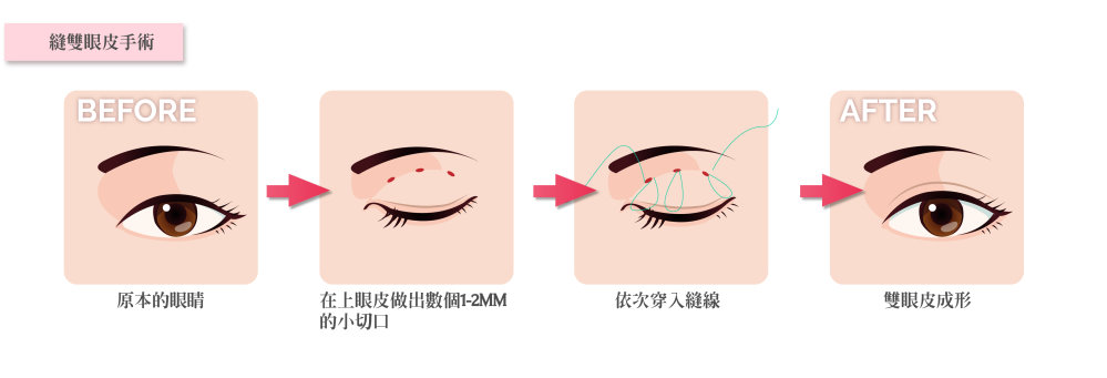 手術方式是在畫線後,在上眼皮適宜的高度上切割數個不超過2mm的小切口,通常為三個不等,切口數量通常視個人情況而定,再用不可吸收的縫線縫出雙眼皮的皺褶。