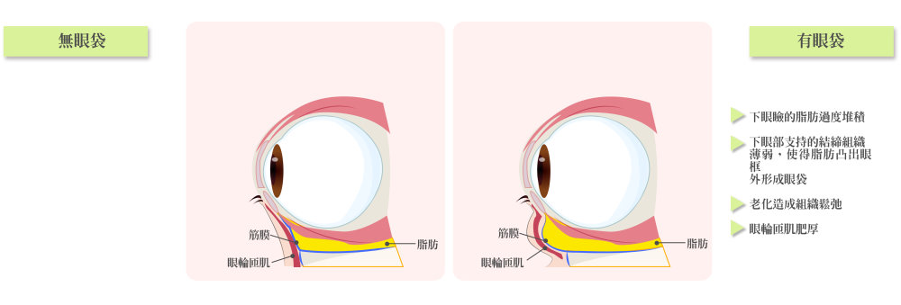 眼袋的形成通常是因為下眼瞼的脂肪過度堆積,或是下眼部支持的結締組織薄弱使得脂肪凸出眼框外形成眼袋,也有人是因老化造成組織鬆弛所致,但若是因為眼輪匝肌肥厚形成的眼袋,就必須診斷明確才能制定正確的診療方案。