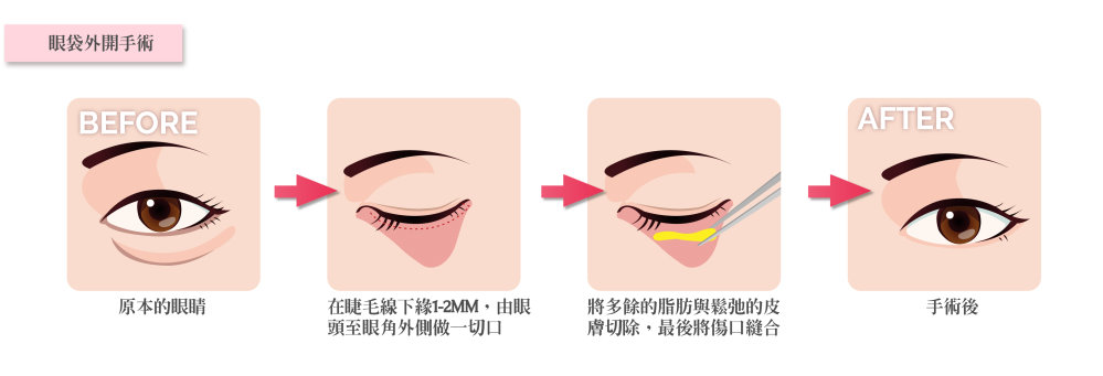 依眼袋形成原因、個人膚況的不同,去除眼袋的手術方式有以下幾種: