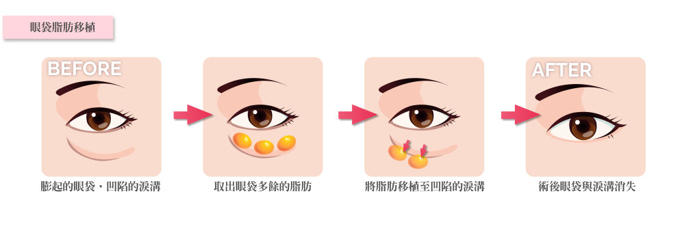 施行眼袋脂肪移植是從結膜內傷口進入,剝離淚溝並將多餘的脂肪移位,若有需要才做下眼皮切口以去除贅皮,手術過程中眼輪匝肌未被碰觸,不只保留臥蠶,也能避免術後白眼露出與眼皮外翻的後遺症。若有因老化導致肌肉鬆垂的受術者,也可利用眼袋手術的機會同時由外眼角切口,將鬆弛的肌肉重新縫合到外眼眶骨內緣,如此一來不僅臥蠶更為緊緻,下緣輪廓也會更為明顯,眼下皺紋也會變淡,使人年輕數歲。