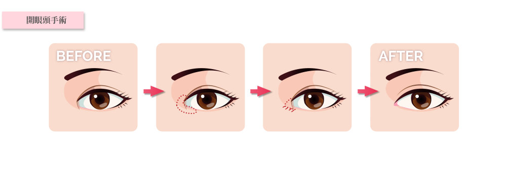 而開眼頭就是做眼角內眥的整形,將內眼角贅皮切除,使眼型拉長、比例有放大效果,依手術切開方式可大致分為直接切開、Z瓣成型術、W瓣成型術、Y-V成型術四種,再依其作各種變化而衍生出市面上玲瑯滿目的手術名稱。
