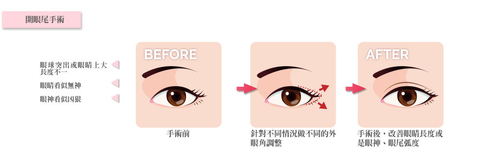 除了眼頭,開眼尾手術也能使眼型增大,通常開眼尾手術多用於眼睛外觀、功能的重建。適用於眼睛太小、眼型太短、眼距太近不適合做開眼頭手術的受術者,手術方式是割去眼尾部分菱形皮瓣,將眼尾打開並將其上提固定,使眼睛更細長圓亮、外眼角弧度更加柔和,眼神自然更為柔媚深邃。