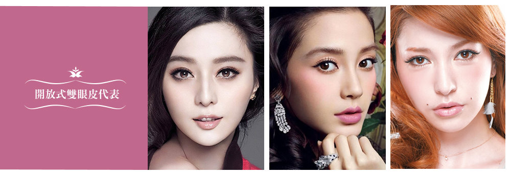 中德混血的Angelababy、知名女星范冰冰、周迅、日本混血模特藤井Lena、好萊塢巨星Natalie Portman、Amanda Seyfrie等人,都擁有亮眼嫵媚的開放式雙眼皮。