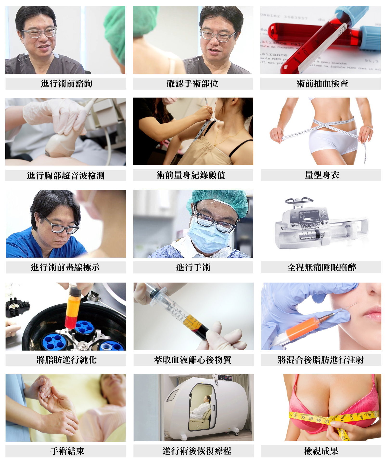 抽取脂肪:手術會在全身麻醉或舒眠麻醉後進行,術前必須在移植區做好記號,並選擇腰腹、臀部或大腿等處脂肪較肥厚的部位抽取脂肪,抽取區會有0.5公分的小傷口。