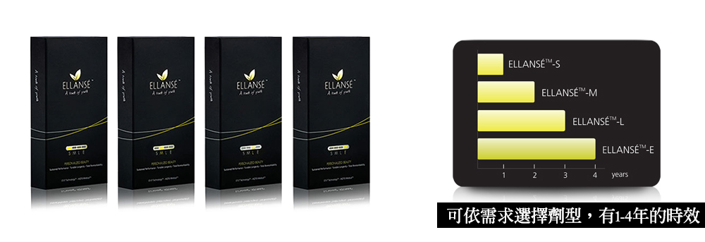 目前Ellanse效力分四版可選擇1至4年的長效可控性,因高濃稠凝膠CMC支撐性佳不會位移,一年內會不斷產生自體膠原蛋白,不像玻尿酸會慢慢被吸收代謝掉,當CMC凝膠載體漸漸被人體吸收的時候,PCL晶球體亦會持續刺激自體組織細胞增生,在皮膚上重建支撐緊實拉提,增厚真皮層並讓Ellanse有效期拉長。