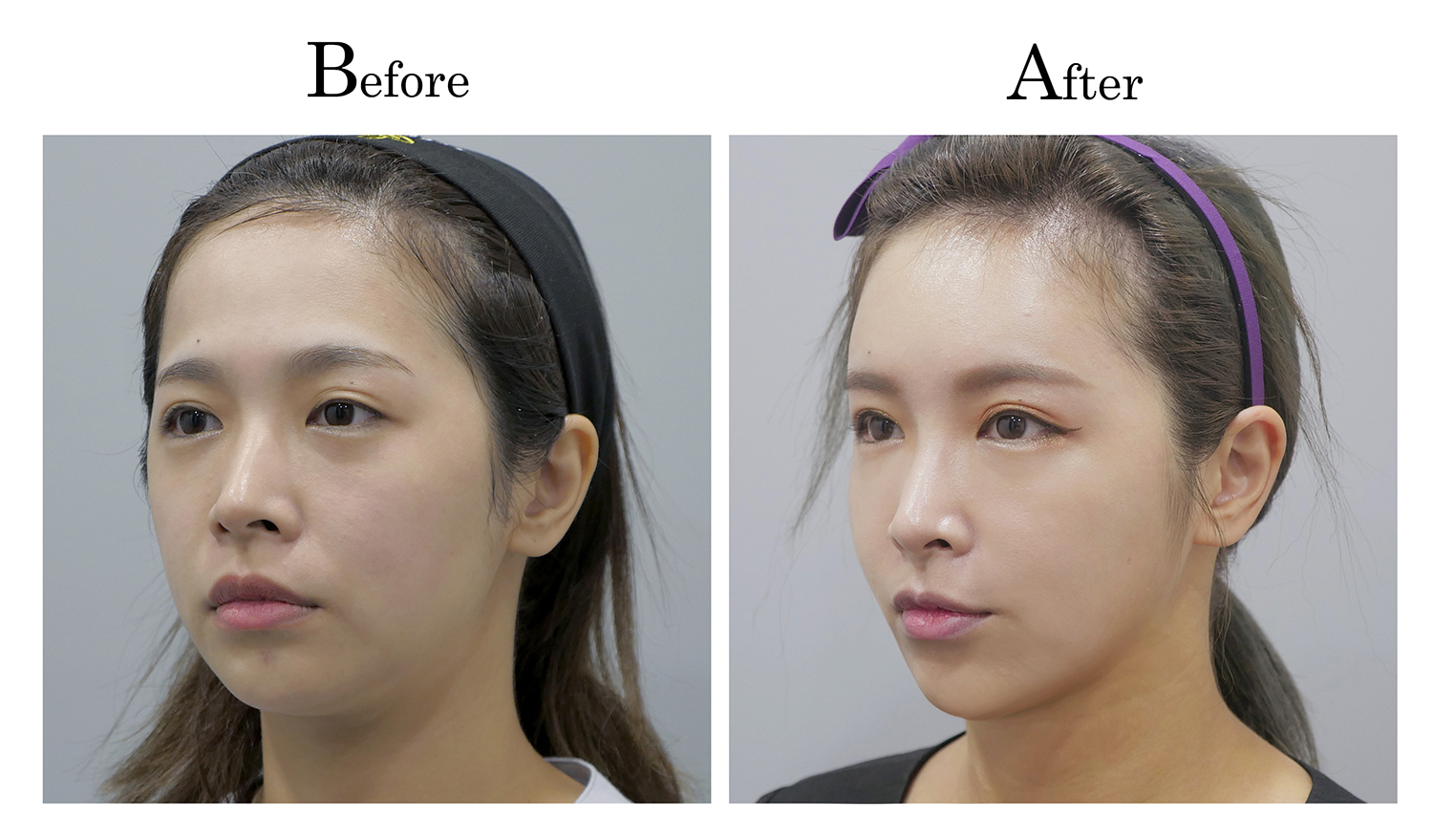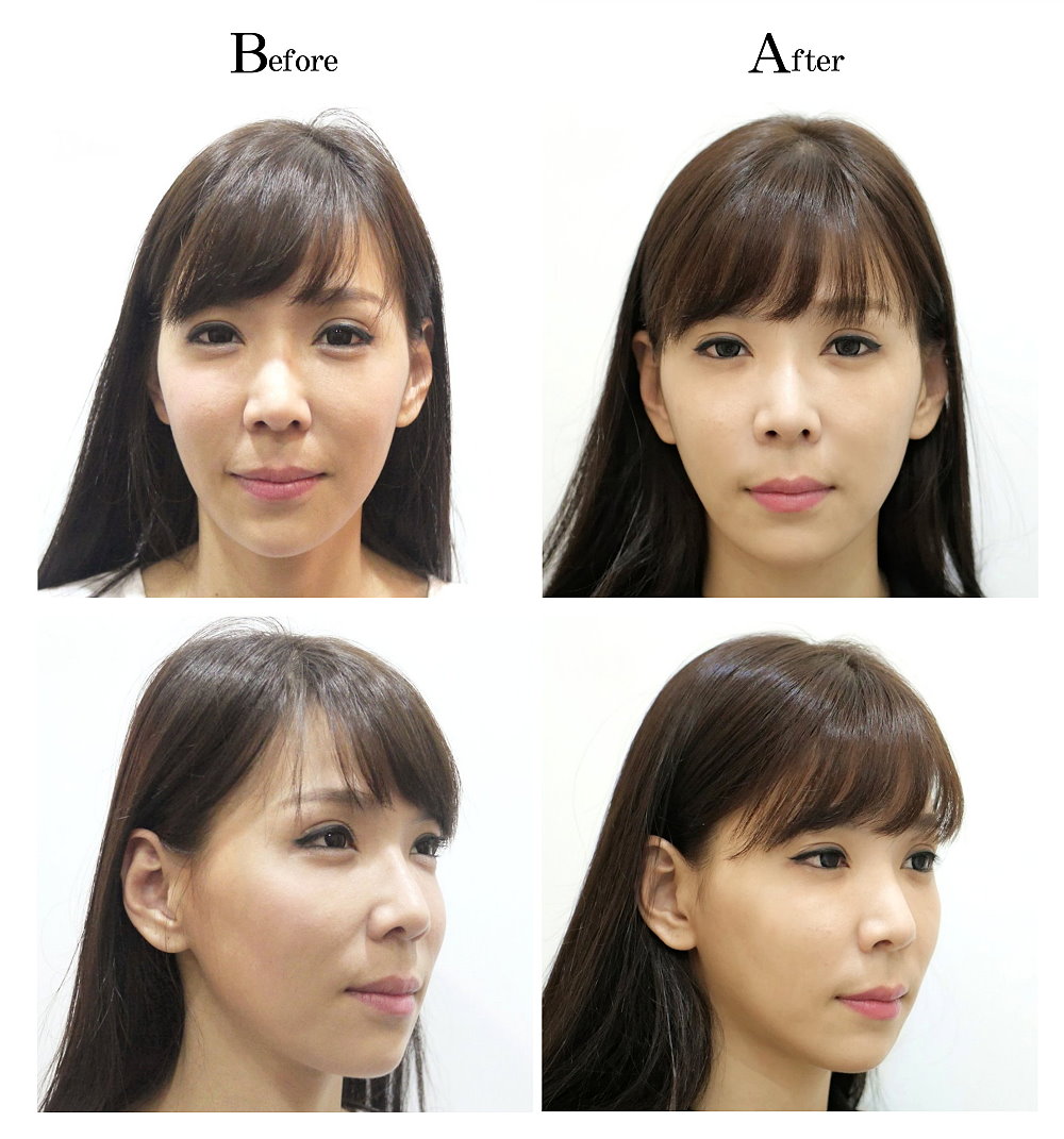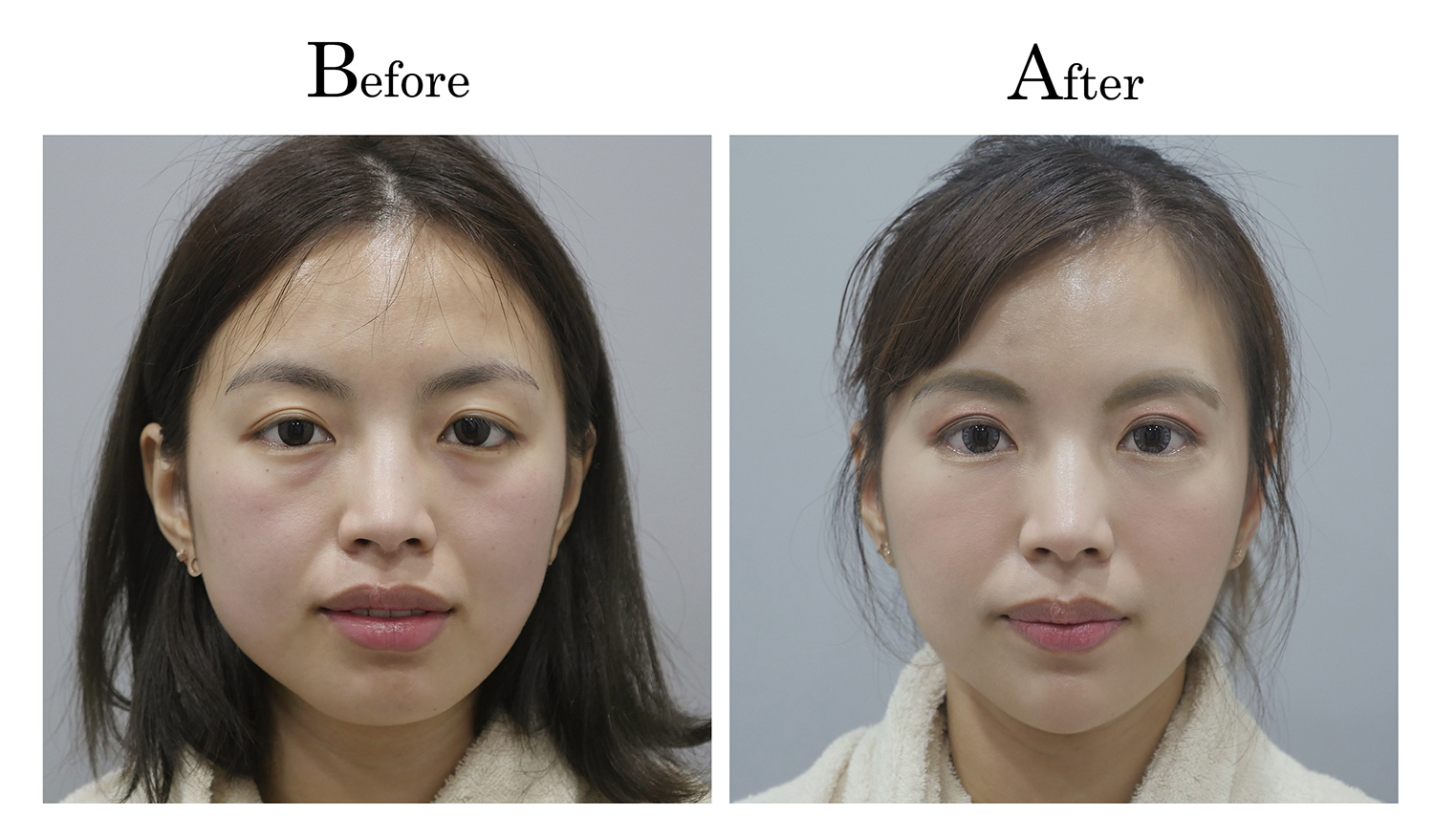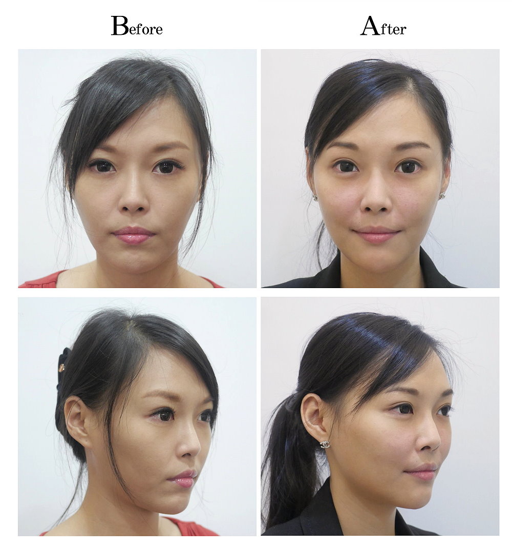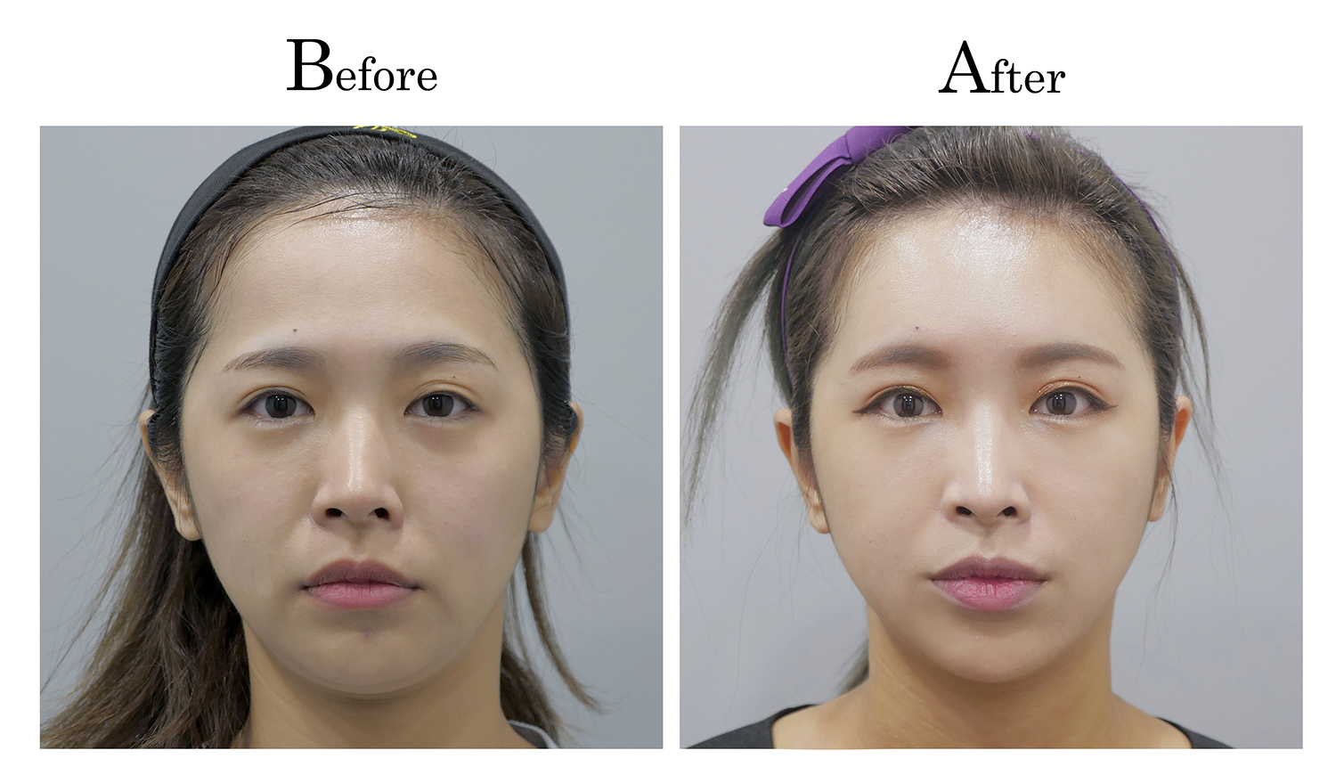 此案例咀嚼肌較為發達,施打肉毒桿菌將其肌肉縮小已達改善臉部下臉較寬的問題,另外臉型因為下巴較短的關係,看起來比較圓,在下巴處施打玻尿酸塑型臉部看起來變得比較長,另外,病患在蘋果肌淚溝交界處有些凹陷,填補洢蓮絲植入劑將蘋果肌填充,透過洢蓮絲內含的聚左旋乳酸刺激膠原蛋白增生,達到長久穩定的效果。