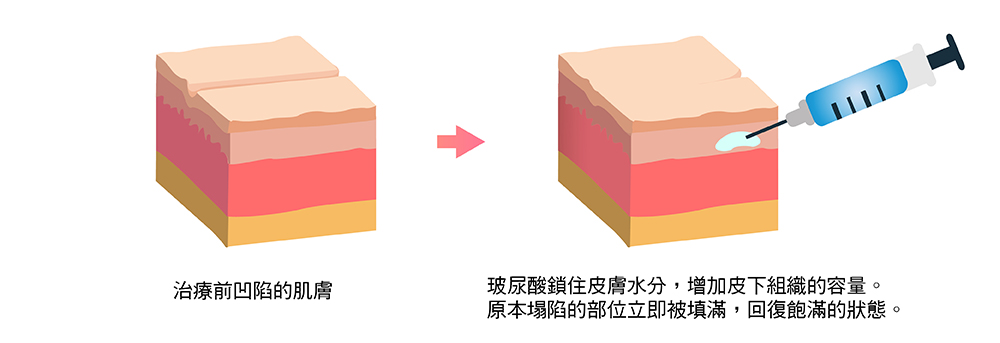 玻尿酸是人體既有的一種物質,生物相容性極高,是種快速且安全的填充劑,注射過後可立即達到淡化細紋、皺紋、填補淚溝與拉提皮膚、改善修飾輪廓等功效,回復個人的自信與風采。
