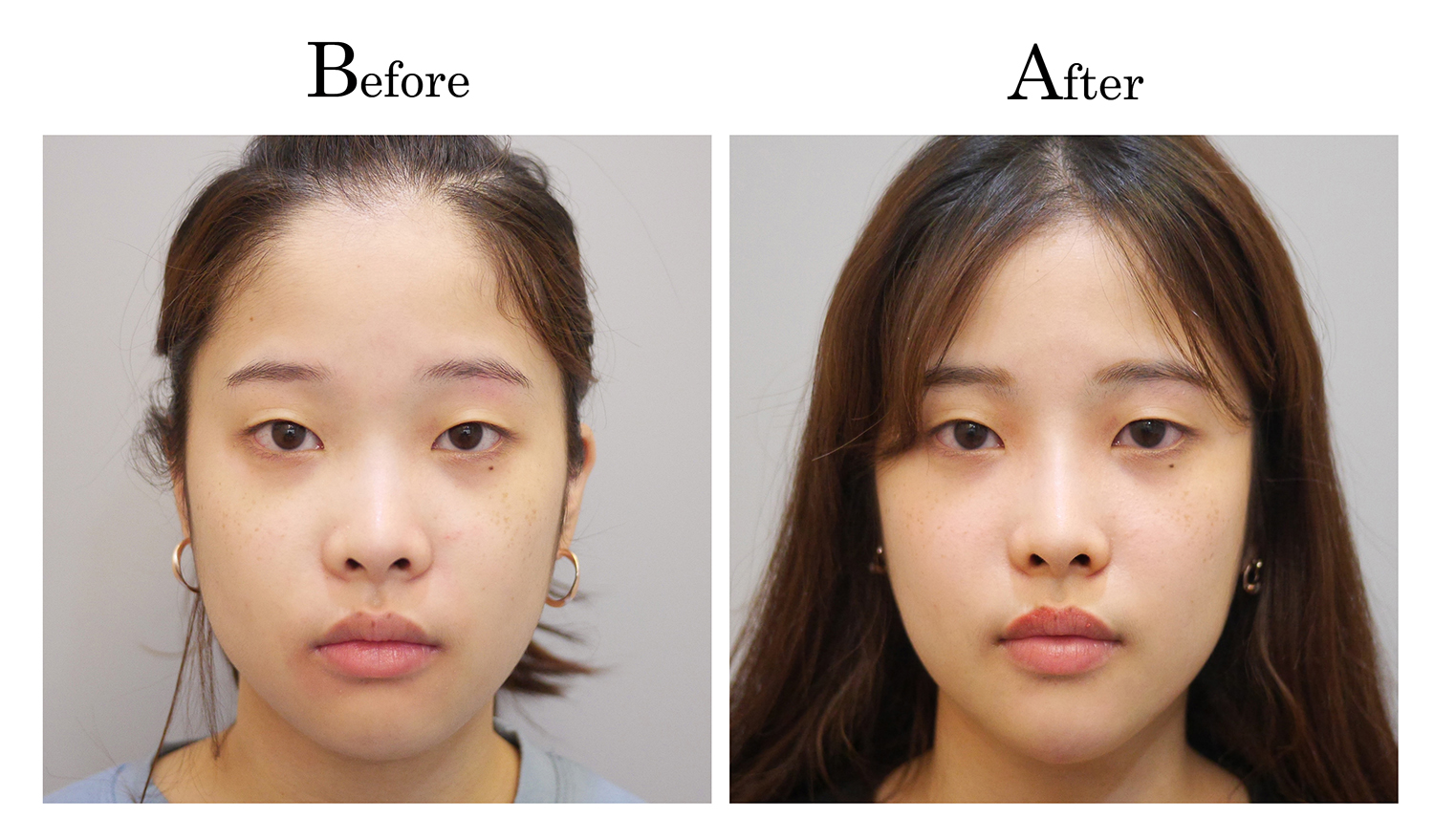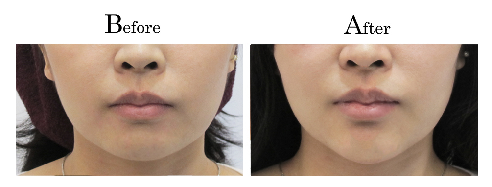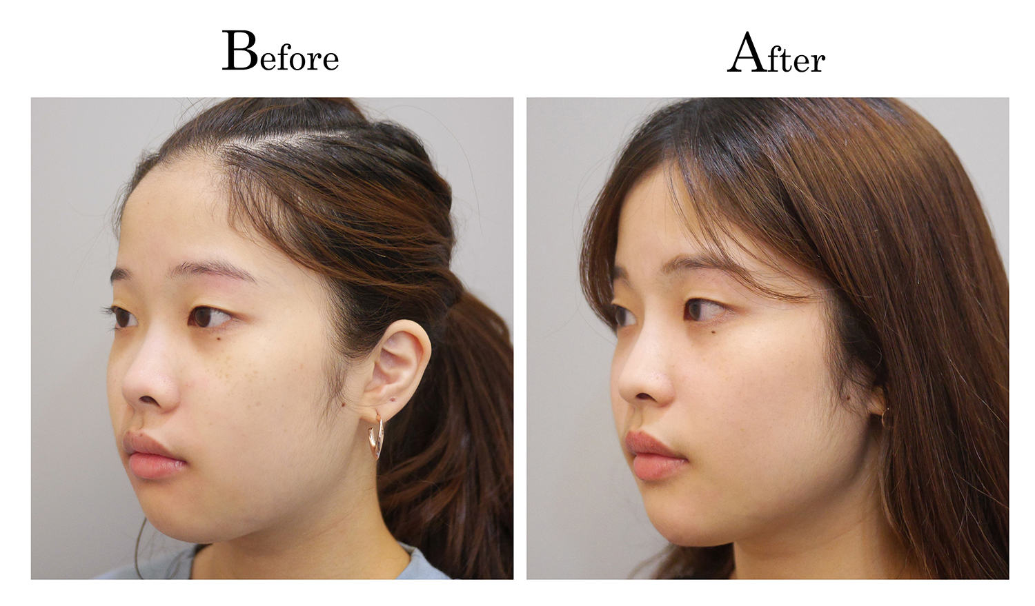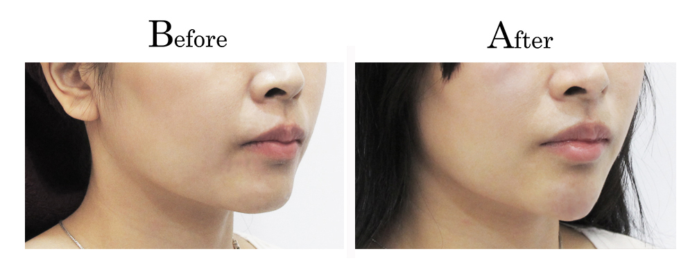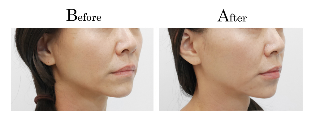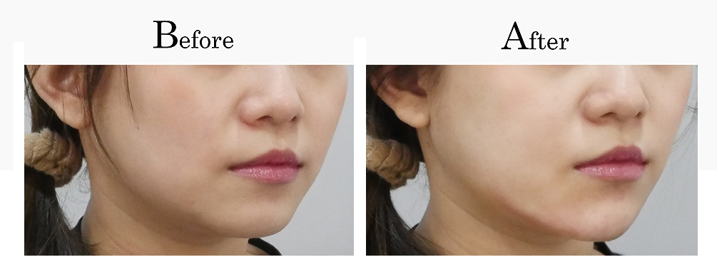 此案例咀嚼肌較為發達,施打肉毒桿菌將其肌肉縮小已達改善臉部下臉較寬的問題,另外臉型因為下巴較短的關係,看起來比較圓,在下巴處施打玻尿酸塑型臉部看起來變得比較長,另外,病患在蘋果肌淚溝交界處有些凹陷,填補洢蓮絲植入劑將蘋果肌填充,透過洢蓮絲內含的聚左旋乳酸刺激膠原蛋白增生,達到長久穩定的效果。