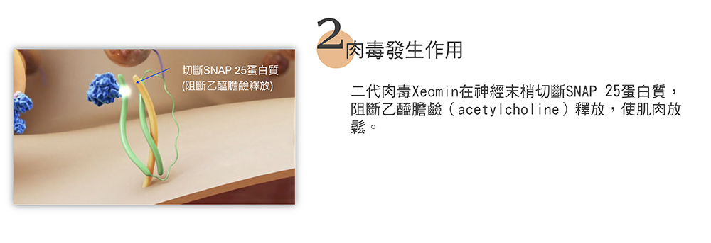 一般而言,經由細菌製造與提煉出的肉毒桿菌素會由一核心毒素(core toxin)和附帶蛋白(accessory protein)所組成。核心毒素能夠阻斷神經末梢釋放乙醯膽鹼(acetylcholine),使肌肉放鬆,進而改善肌肉收縮引起的動態皺紋;而附帶蛋白不帶有任何毒性與功效,但有保護核心毒素免於遭受外來溫度與PH值破壞的功效,而Xeomin適用特別方法,將附帶蛋白除去,使之變成裸毒素。