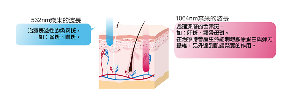 而淨膚奈米級銣雅鉻雷射屬於雙波頻的雷射治療,532nm短波長可以治療表淺性的色素斑(如:雀斑);1064nm長波長用被利用來較深的真皮性色素斑(如肝斑、顴骨母斑等),與此同時,1064nm波長雷射在治療時會產生熱能刺激膠原蛋白與彈力纖維,因此能另外達到肌膚緊實的作用。