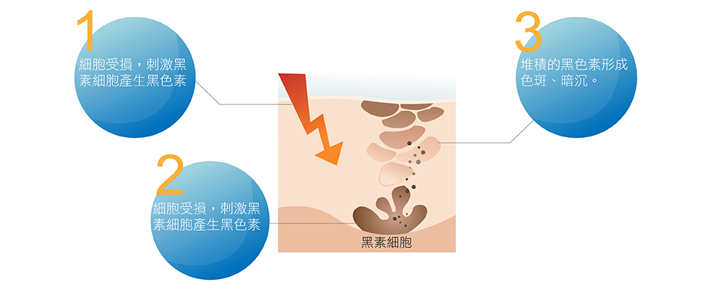 黑素細胞分布於皮膚的表皮層,其功能就是製造黑色素,在接受刺激的狀況下,黑素細胞就會活化,開始製造黑色素。而誘發黑素細胞活化的成因有以下: