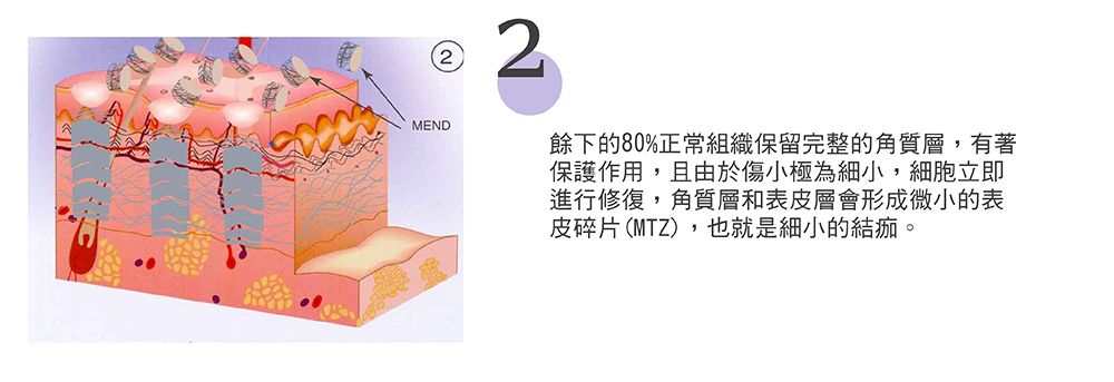 將極細小、紅外線不同波長的雷射光束打入真皮層(依儀器廠牌的不同,波長也有所不同),造成肉眼不可見的微小創傷,激發周圍細胞的修復能力並促進膠原蛋白增生,因此除了治療凹疤,也兼具了皮膚回春、除皺與除斑的功效。每次的飛梭雷射治療只破壞一小部分約20%的皮膚組織,不會造成大範圍的創傷,餘下的80%正常組織保留完整的角質層,有著保護作用,且由於傷小極為細小,細胞立即進行修復,表皮會在24小時內癒合,更新皮膚,改善疤痕。