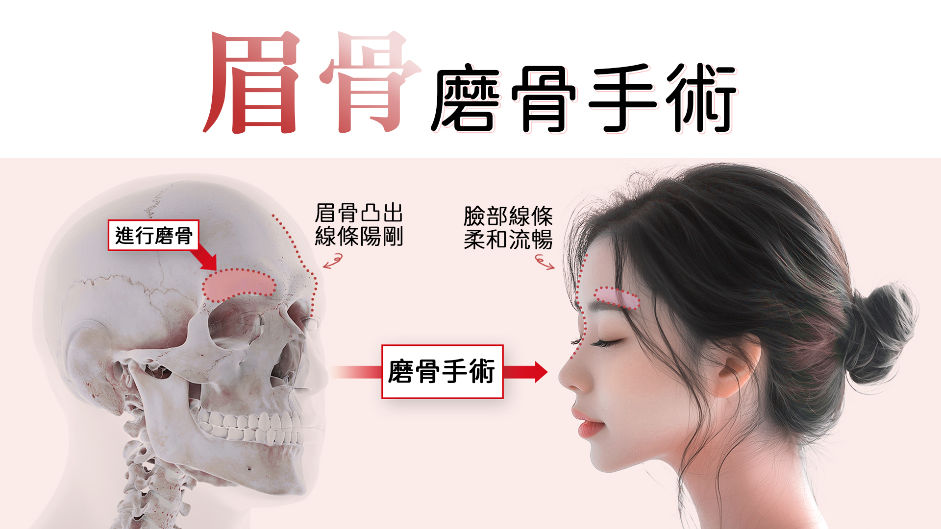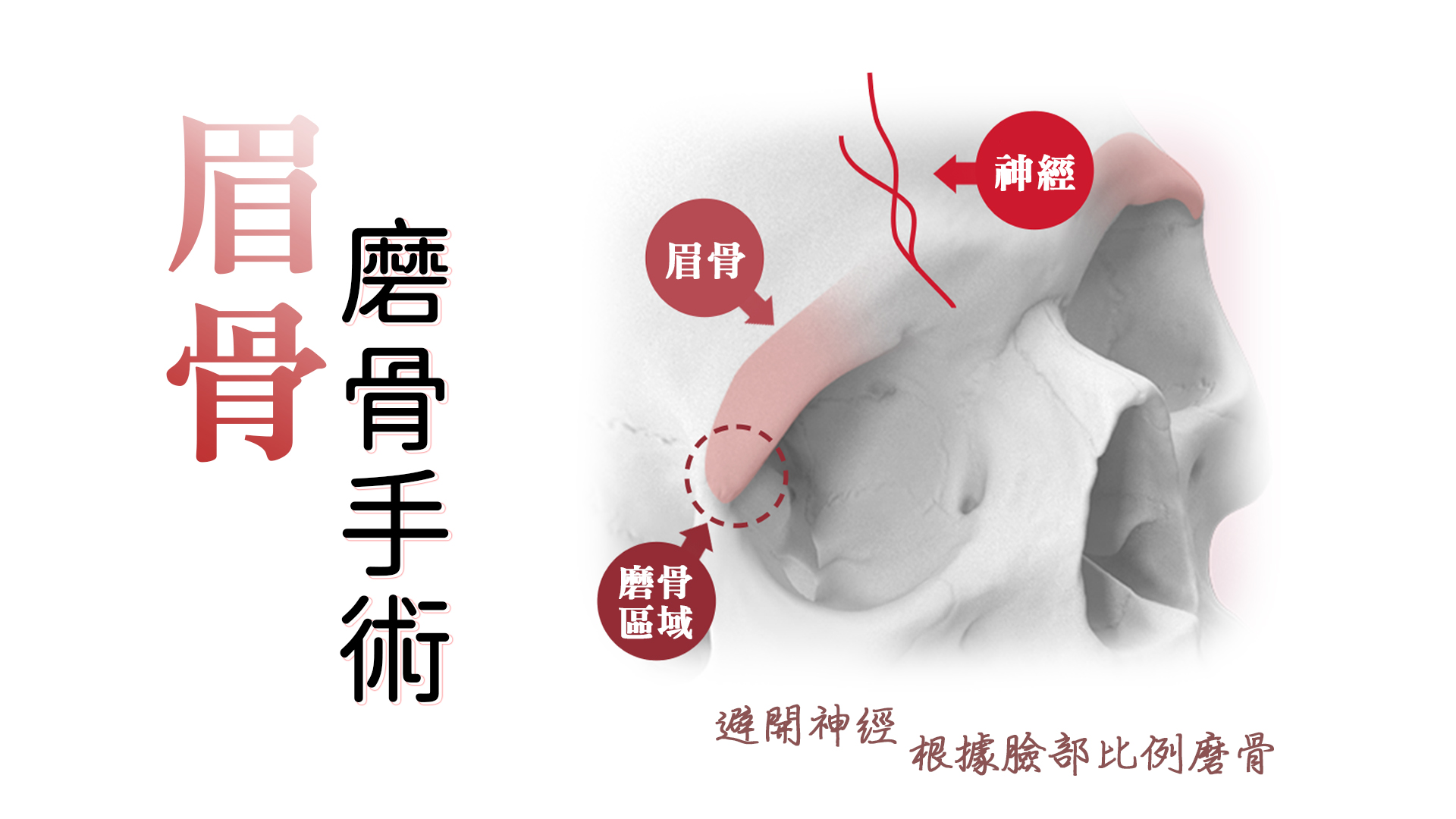 針對輕微不順的臉部輪廓,磨骨手術是一種改善方法,透過精細的磨骨鑽將外層骨質磨薄,調整寬度和厚度,以達到使臉部輪廓變得柔和而精緻的效果。磨眉骨手術是一種微小的調整手術。