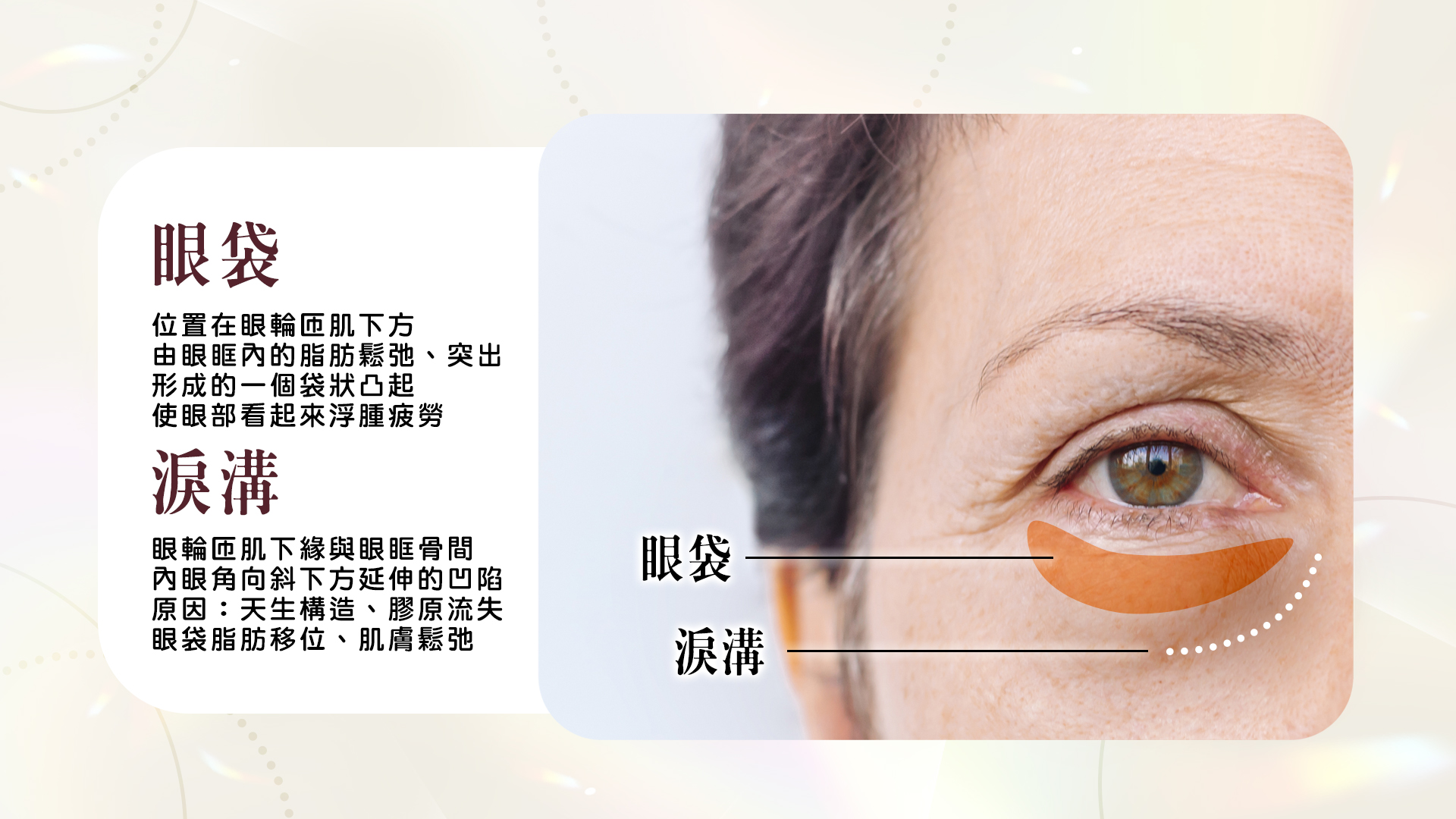 眼袋位於眼下的臥蠶下方,在一些嚴重眼袋的患者中,由於脂肪肥厚,眼袋可能覆蓋住臥蠶,使整個眼下區域的脂肪面積更大更明顯;而淚溝則位於眼袋下方,從內眼角開始延伸,呈現凹陷的狀態,嚴重的膠原蛋白流失將進一步突顯肥厚的眼袋和疲態的淚溝。因此,許多人選擇眼袋手術和淚溝填補來改善眼周的老化現象,使整體視覺年齡看起來更年輕,透過下方內容的解說,您將更了解哪種方式適合您!