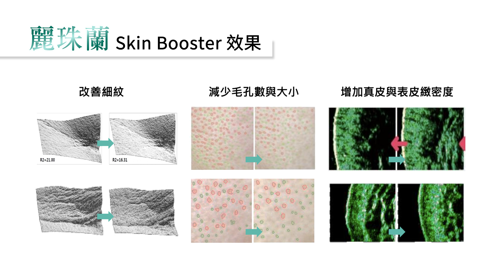 使用電動微針儀器在皮膚表面進行微創刺激,或是在進行水光針療程後,將麗珠蘭精華塗抹於針孔處,以利於滲透至真皮層,適合毛孔粗大、細紋及油水失衡的肌膚,可深層補水修護,改善皮膚質地與彈性,提升整體治療效果。
