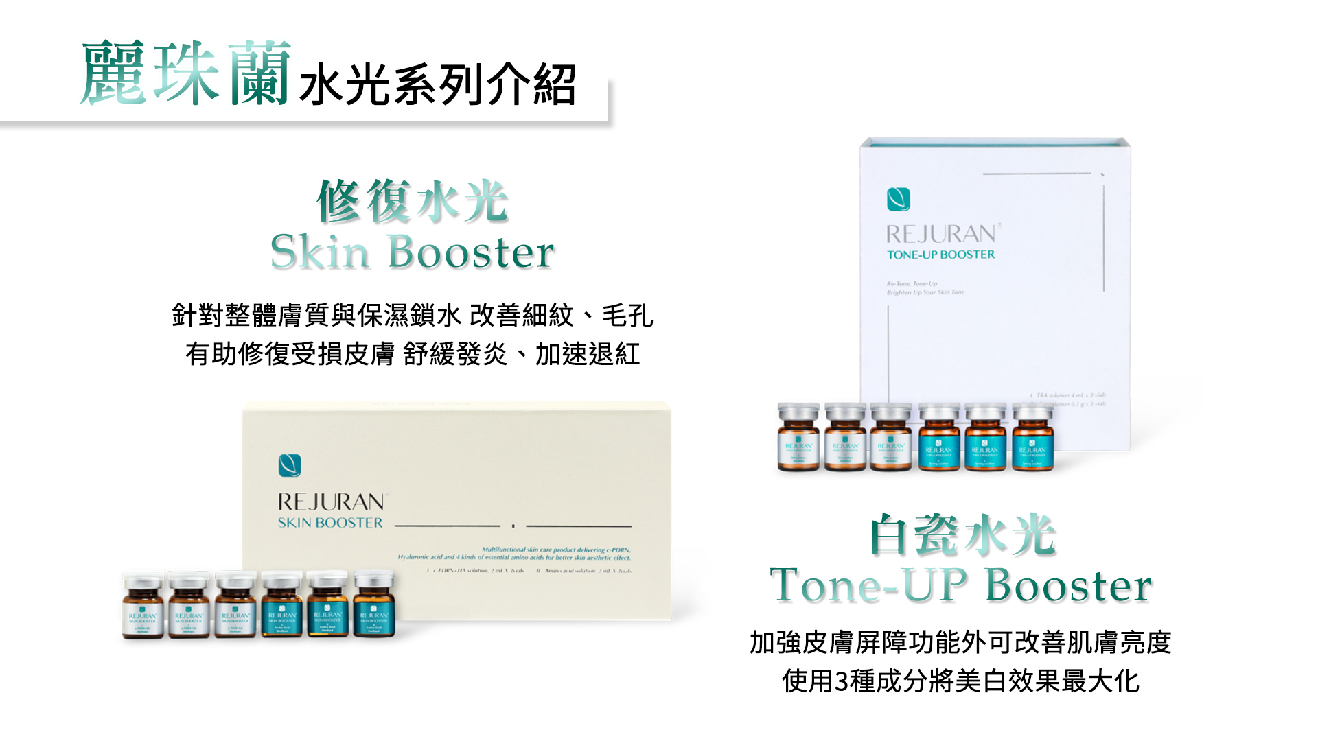 Rejuran麗珠蘭 Booster 水光系列:適合用於滾針、微針等中胚層療法的微創水光產品,為盒裝套組。具有兩種劑型。
