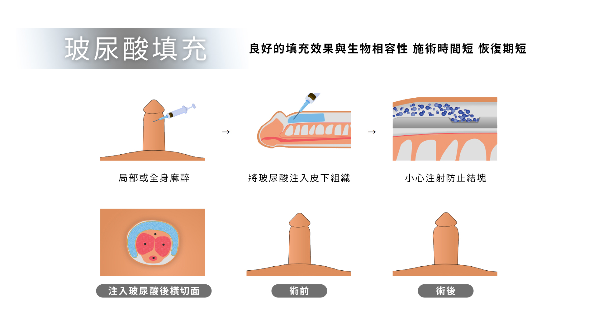 1.玻尿酸注射:透過高分子玻尿酸注入陰莖皮下增加粗度。