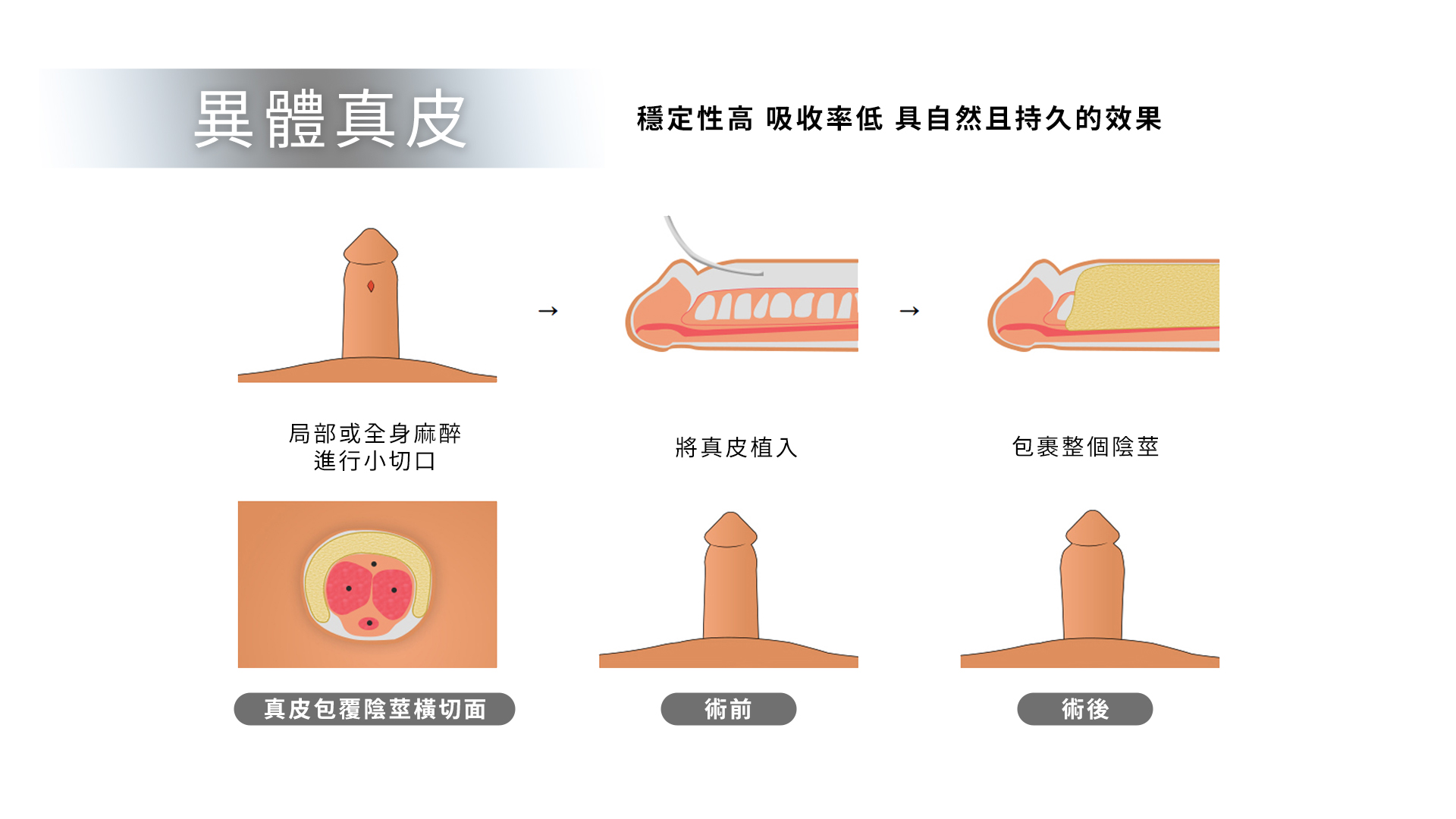 異體真皮粉填充:使用異體真皮粉作為填充物,改善龜頭的大小和形狀。