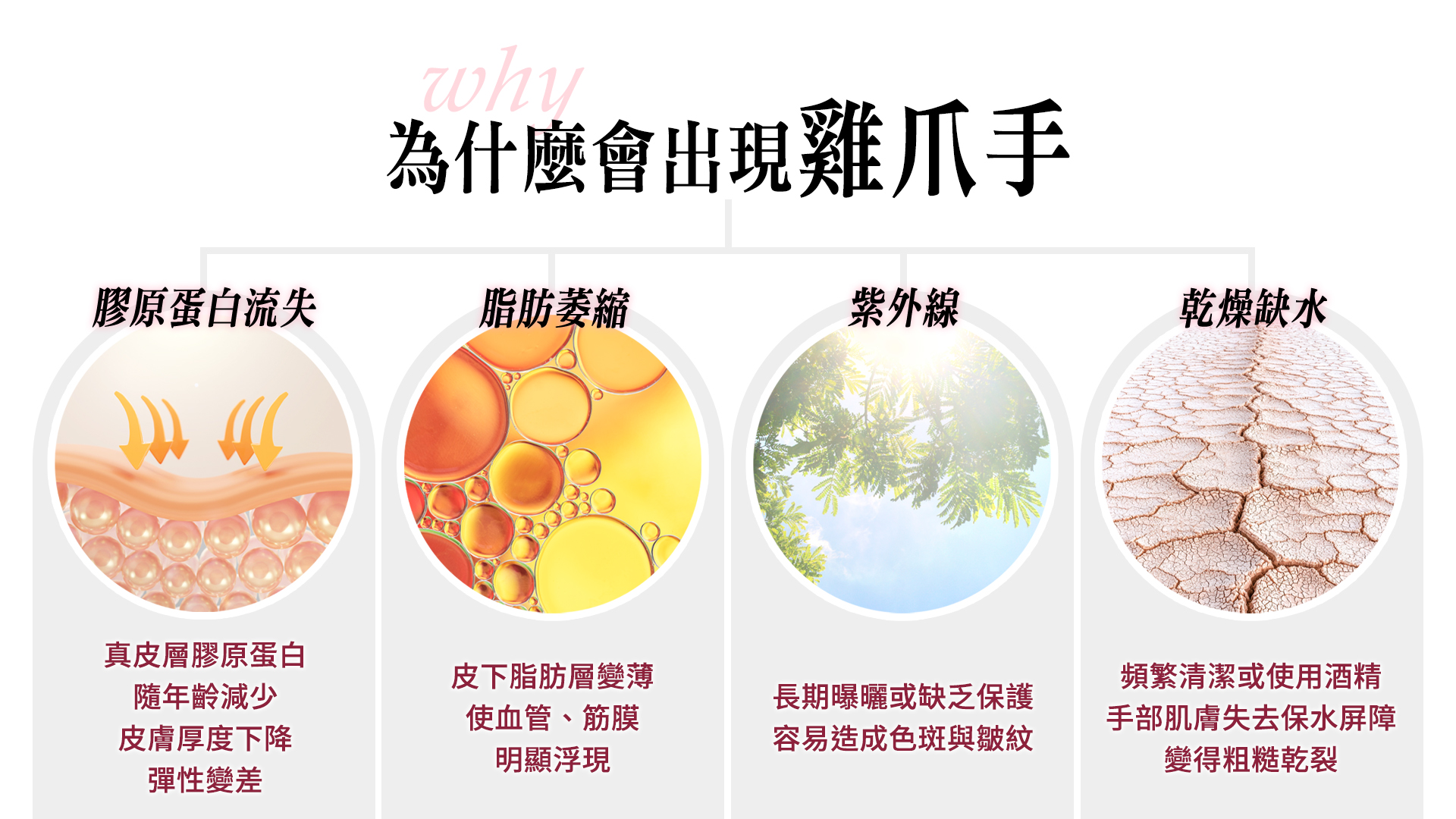 手部也會洩漏年齡?許多人臉部緊緻無瑕,卻忽略了手部的歲月痕跡。手部皮膚天生較薄、皮下脂肪層少,隨著年齡增加、膠原蛋白與脂肪流失,靜脈與筋膜線條便會逐漸浮現,讓手背看起來乾枯、鬆弛,也就是常見的「雞爪手」。