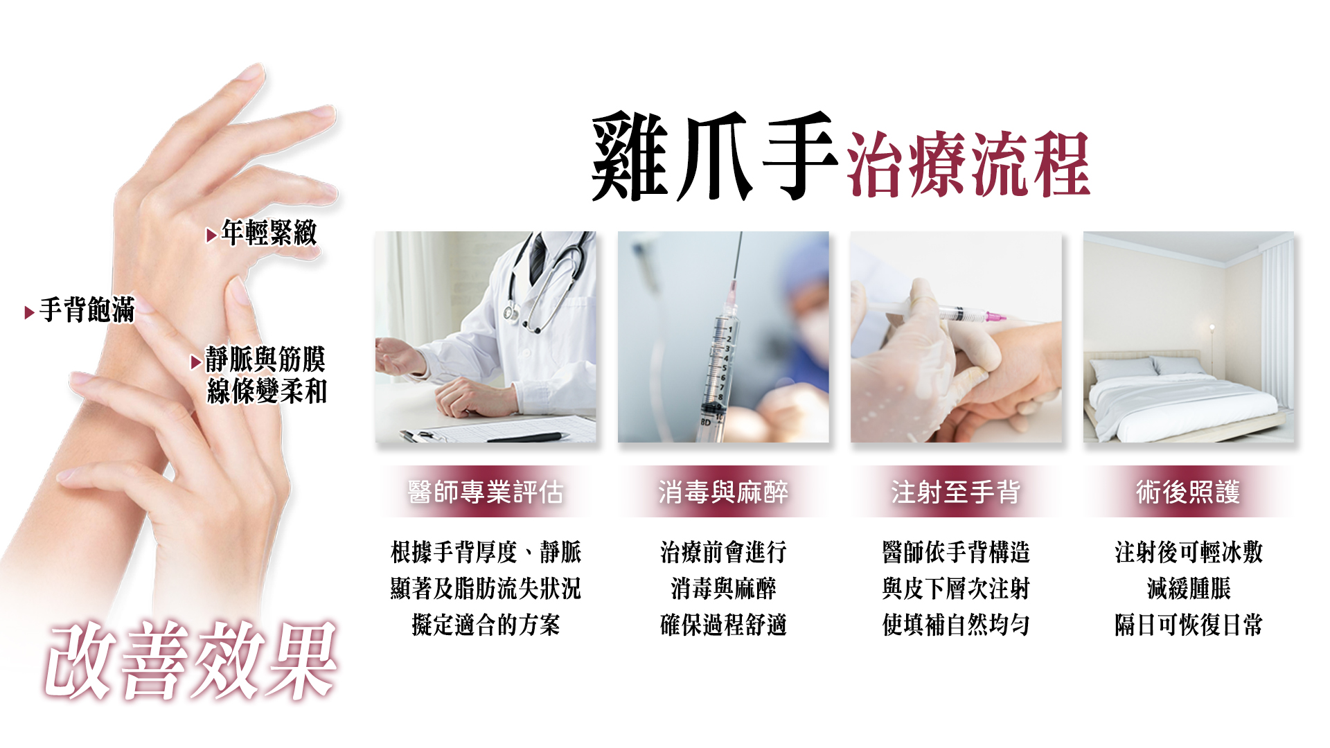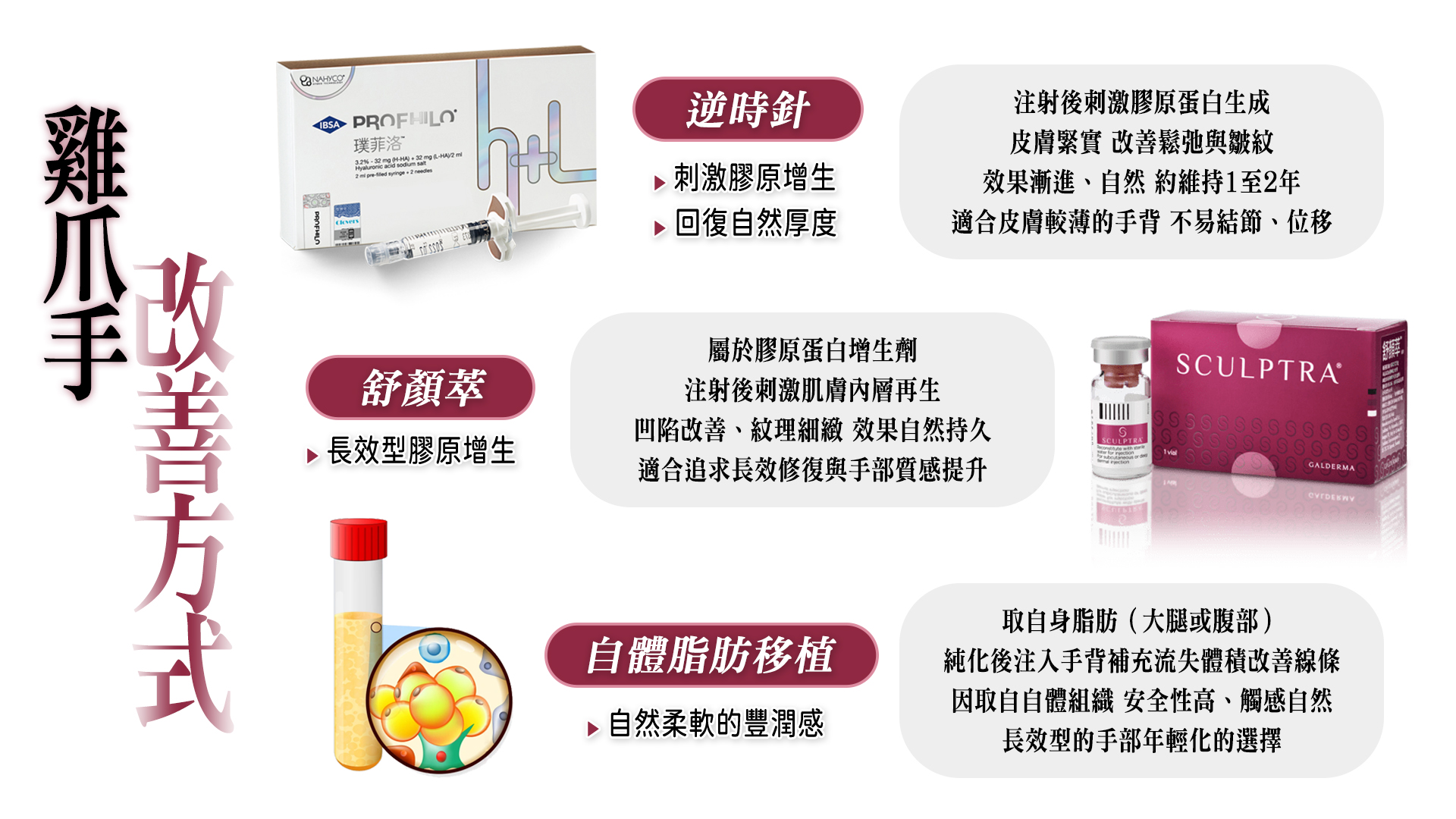 雞爪手改善療程主要透過微整形注射進行,常見選擇包括: