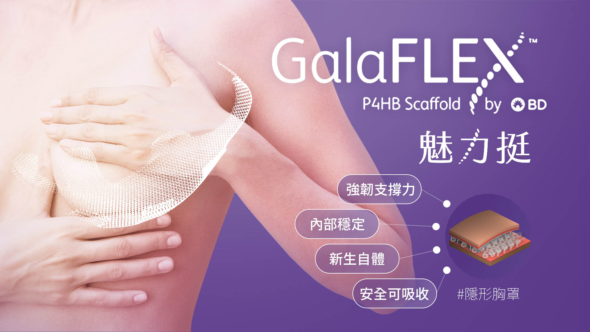 魅力挺亦稱為 GalaFLEX™乳房支撐網,廣泛應用於全球乳房整形和重建手術,專為強化、穩定和支撐乳房組織而設計,是一種在手術過程中植入的乳房支撐網。