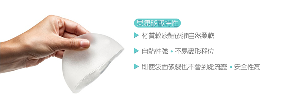 果凍矽膠義乳(即凝聚型矽膠義乳)是由三到四層不同功能的外層組成。內填最高醫療等級的高凝聚型矽膠,並通過美國FDA,歐洲CE Mark及台灣衛生署核准