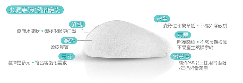 水滴型果凍矽膠已於2015年7月衛生署核准上市,相較於果凍矽膠義乳的圓形,它的側面呈現手滴狀,和人體乳房形狀更貼近、更為擬真,改善果凍矽膠隆乳術後較易產生形狀不自然的問題,義乳的尺寸也更為精細,就其長寬高相乘有各種不同尺寸的選擇,消費者可以依自己身材胸型的不同做選擇,更符合現今量身訂做、客製化的需求。