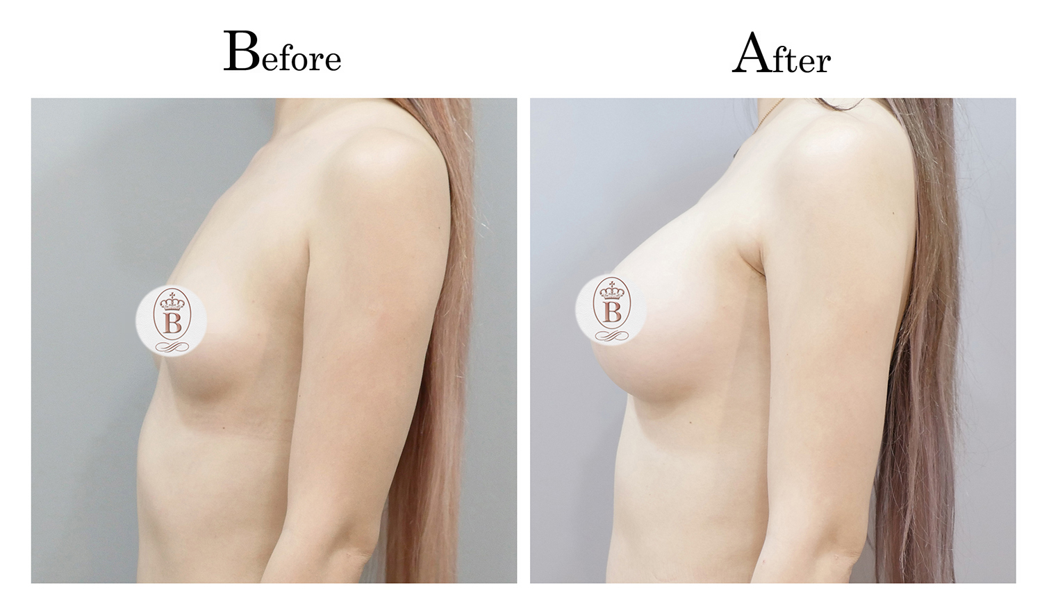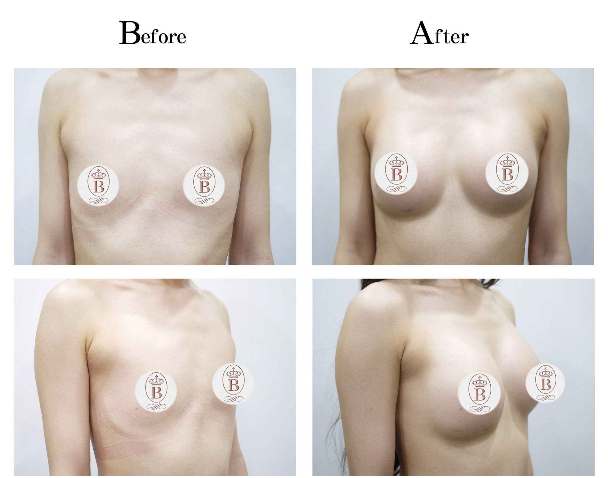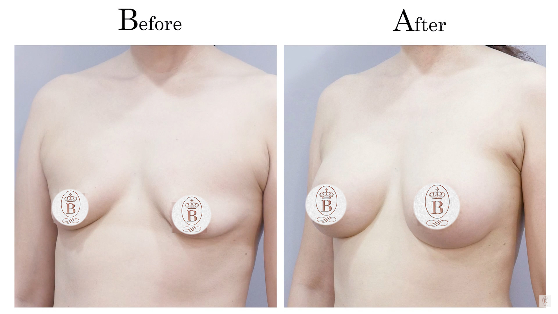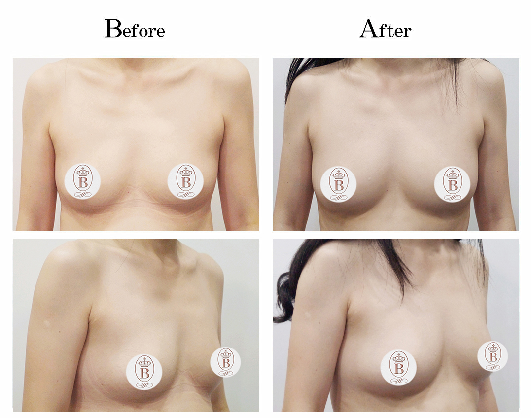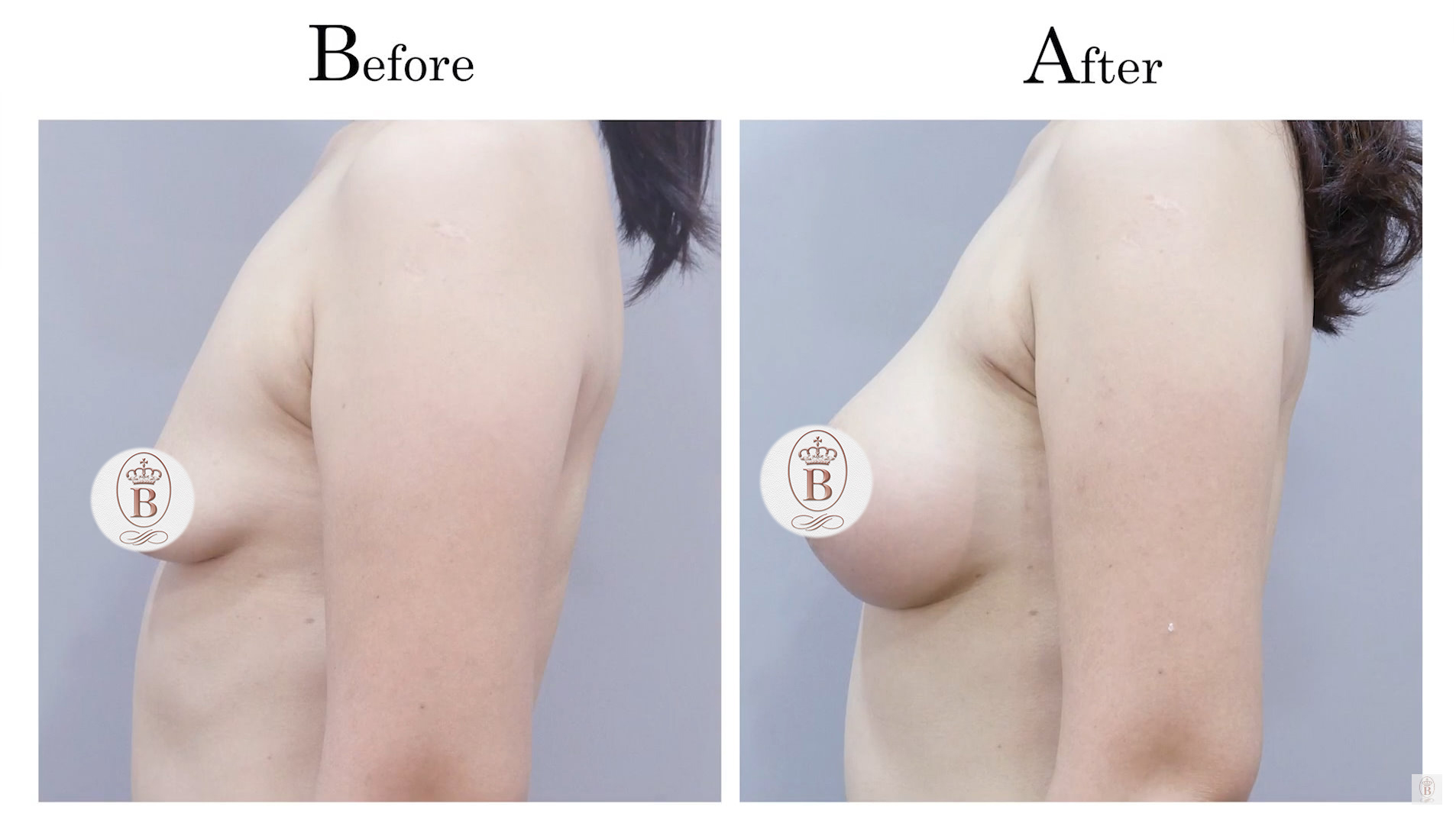 此案例的上胸與胸側較沒有肉、扁平甚至是凹陷,胸型反而有下垂的錯覺,但皮膚下有足夠的空間注射多量脂肪,因此醫師抽取腰腹的健康脂肪,將之移植至上胸、胸側原本不足之處,即此由B躍升至D罩杯,另外由於用的是自體脂肪,沒有異體物排斥的問題,只待穩定過後存活下來的脂肪即能永久存活,相當適合排斥異體植入或擔心莢膜攣縮的受術者。