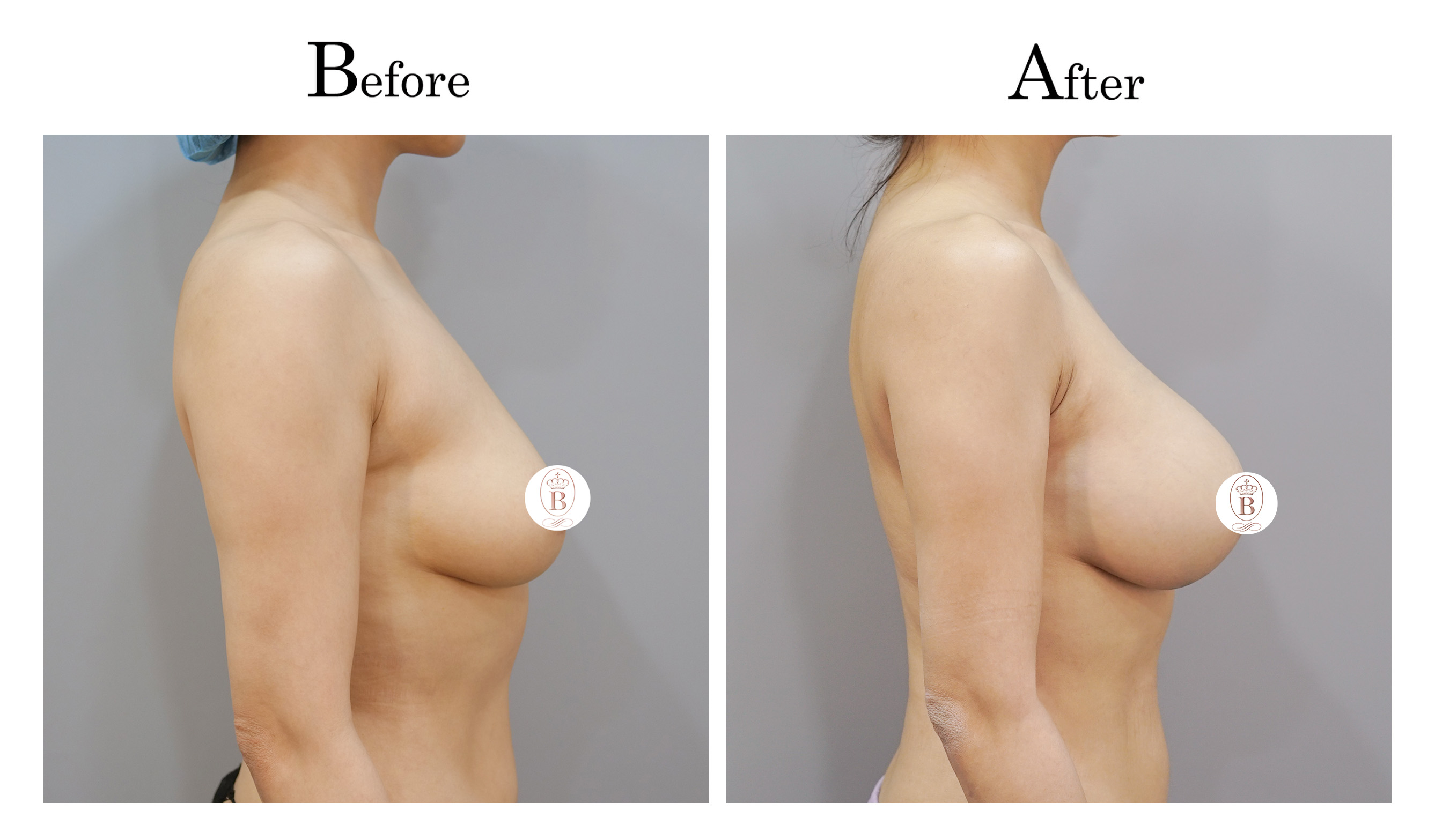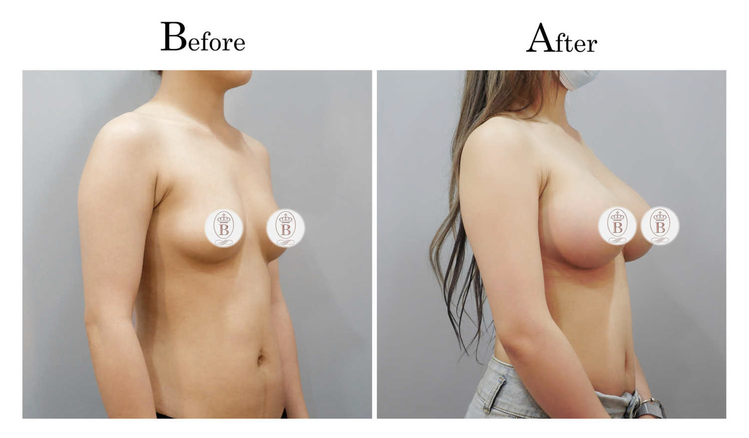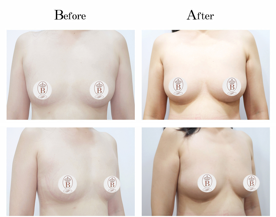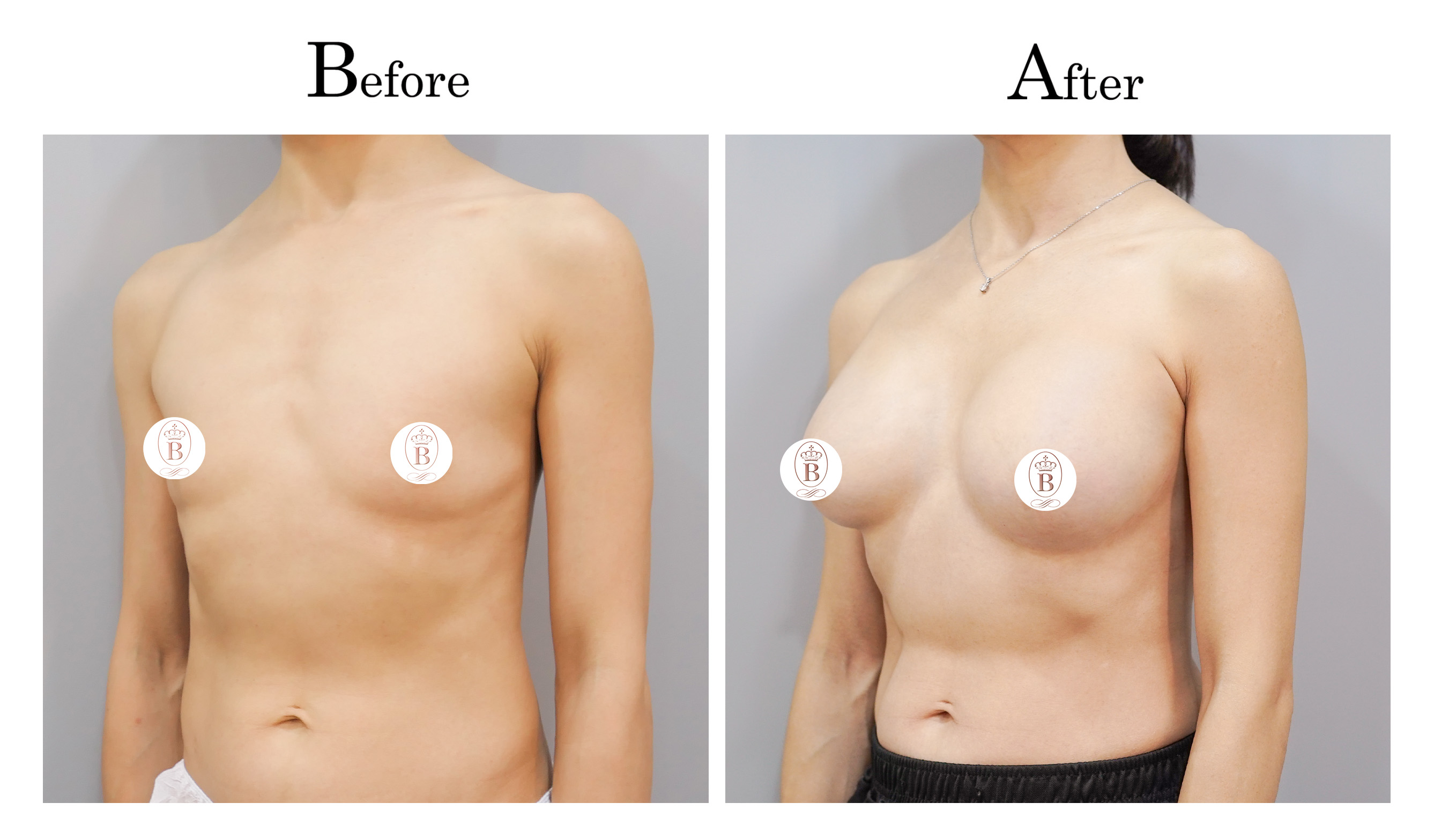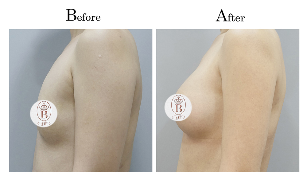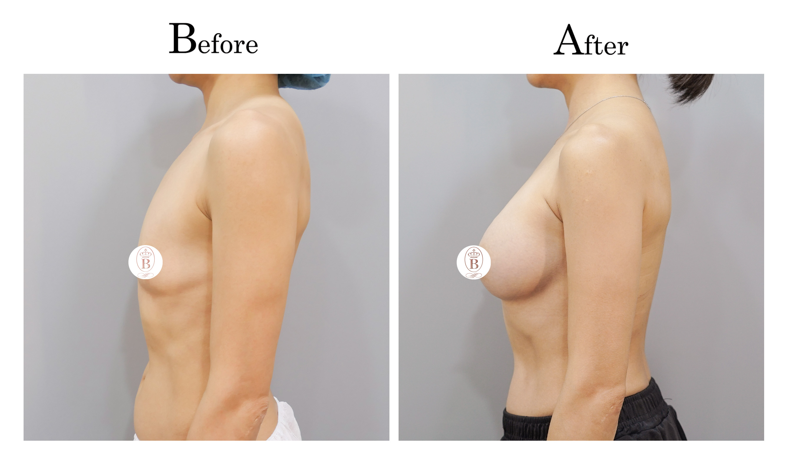 此案例的上胸與胸側較沒有肉、扁平甚至是凹陷,胸型反而有下垂的錯覺,但皮膚下有足夠的空間注射多量脂肪,因此醫師抽取腰腹的健康脂肪,將之移植至上胸、胸側原本不足之處,即此由B躍升至D罩杯,另外由於用的是自體脂肪,沒有異體物排斥的問題,只待穩定過後存活下來的脂肪即能永久存活,相當適合排斥異體植入或擔心莢膜攣縮的受術者。