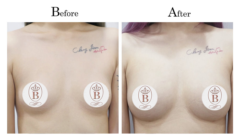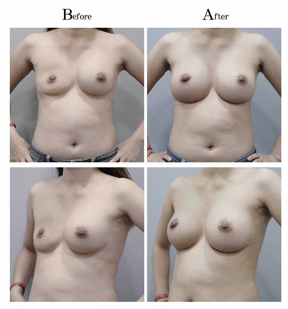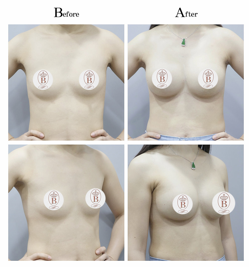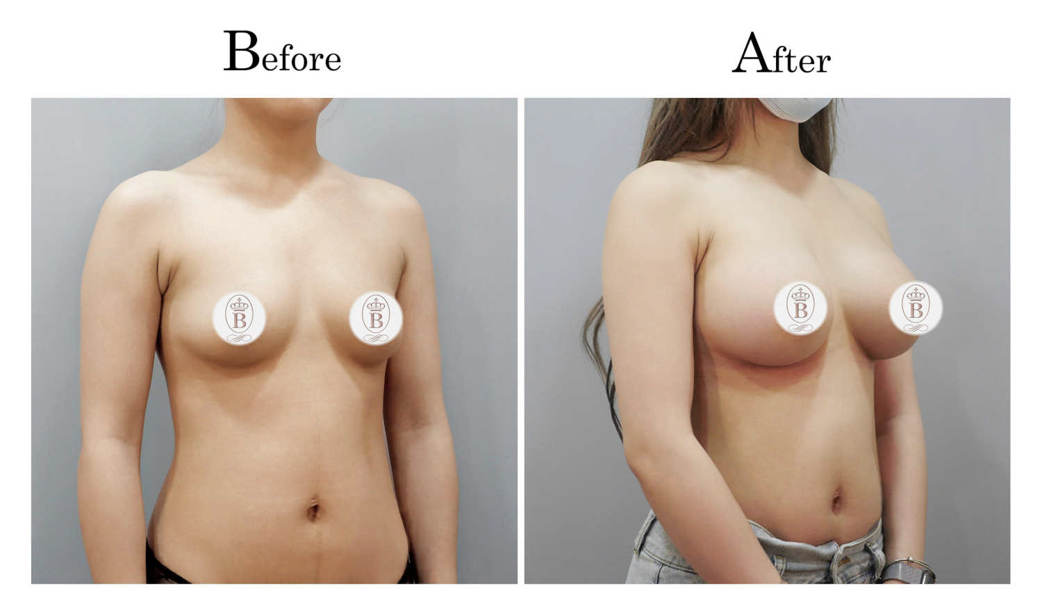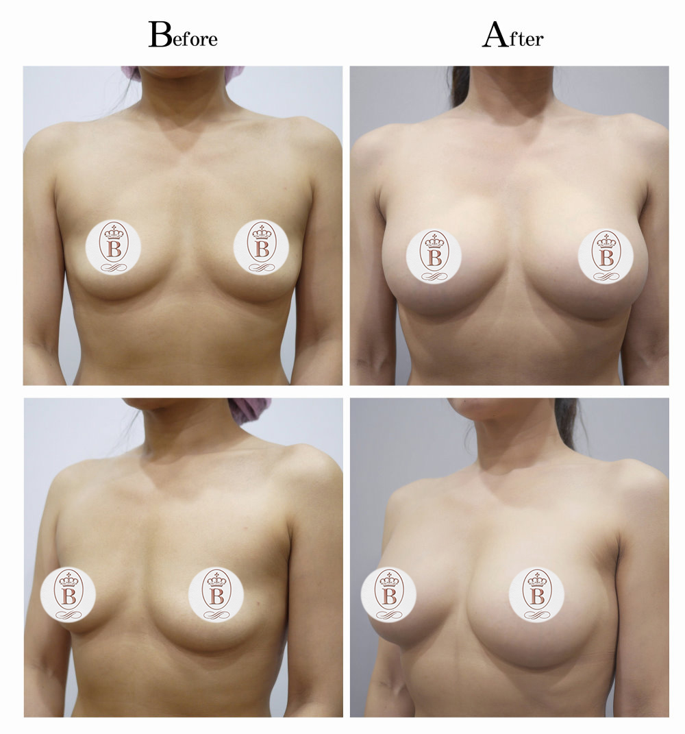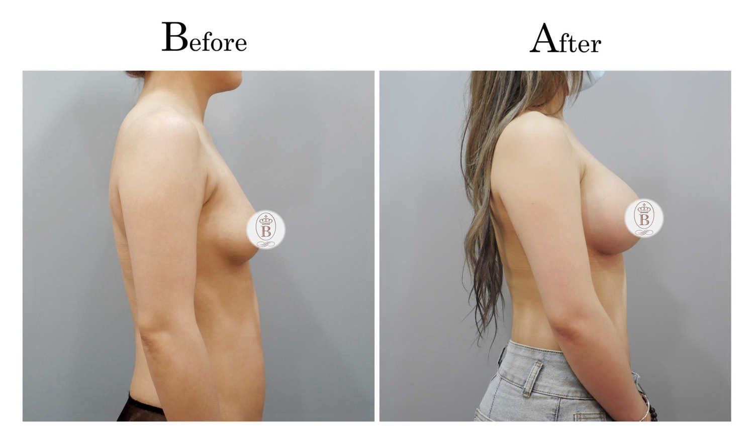此案例的上胸與胸側較沒有肉、扁平甚至是凹陷,胸型反而有下垂的錯覺,但皮膚下有足夠的空間注射多量脂肪,因此醫師抽取腰腹的健康脂肪,將之移植至上胸、胸側原本不足之處,即此由B躍升至D罩杯,另外由於用的是自體脂肪,沒有異體物排斥的問題,只待穩定過後存活下來的脂肪即能永久存活,相當適合排斥異體植入或擔心莢膜攣縮的受術者。