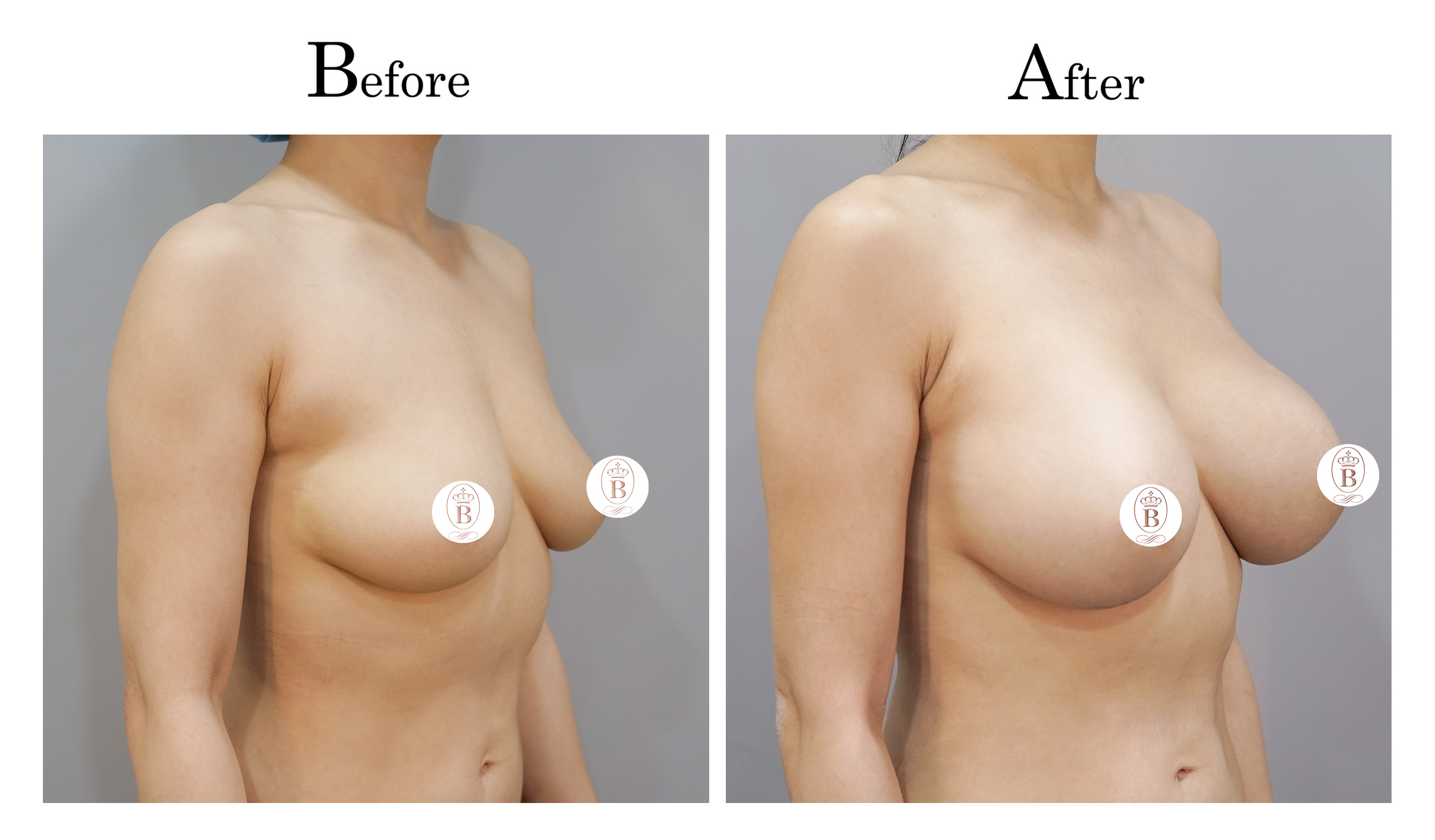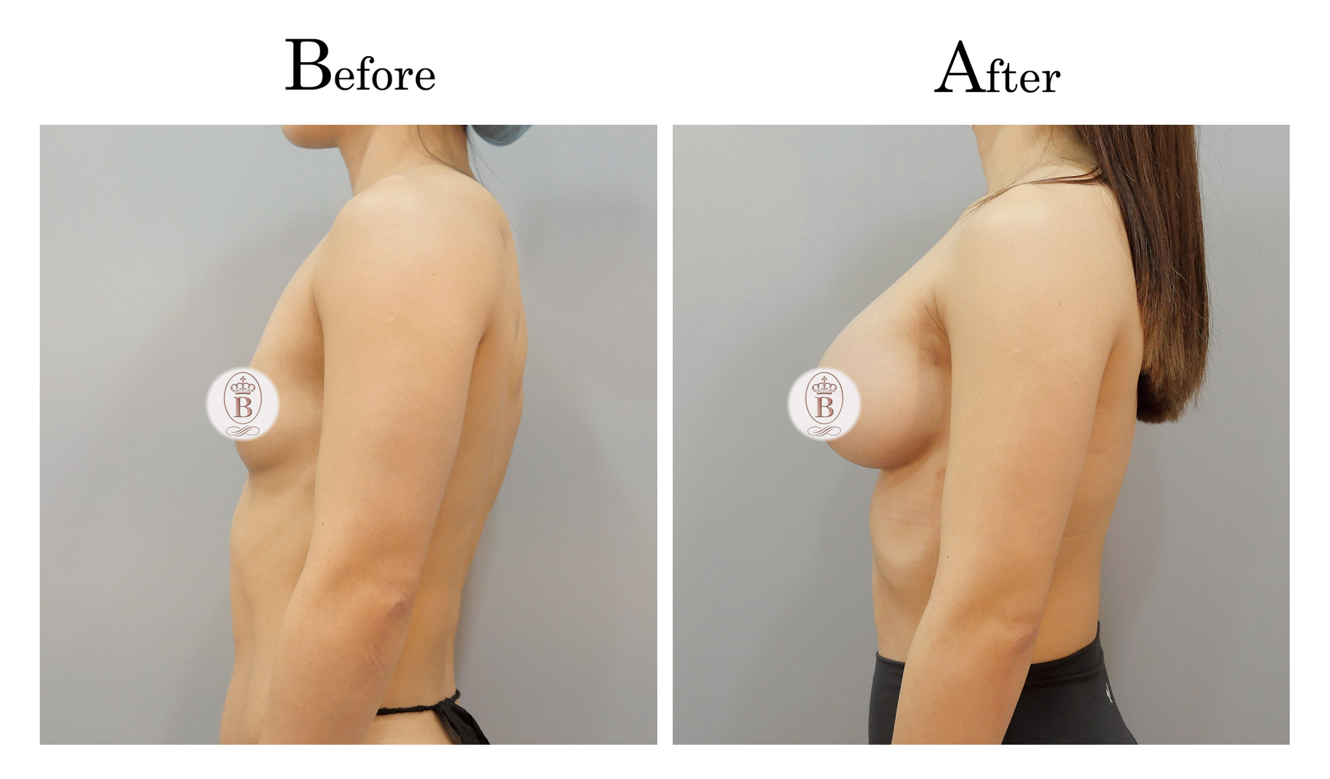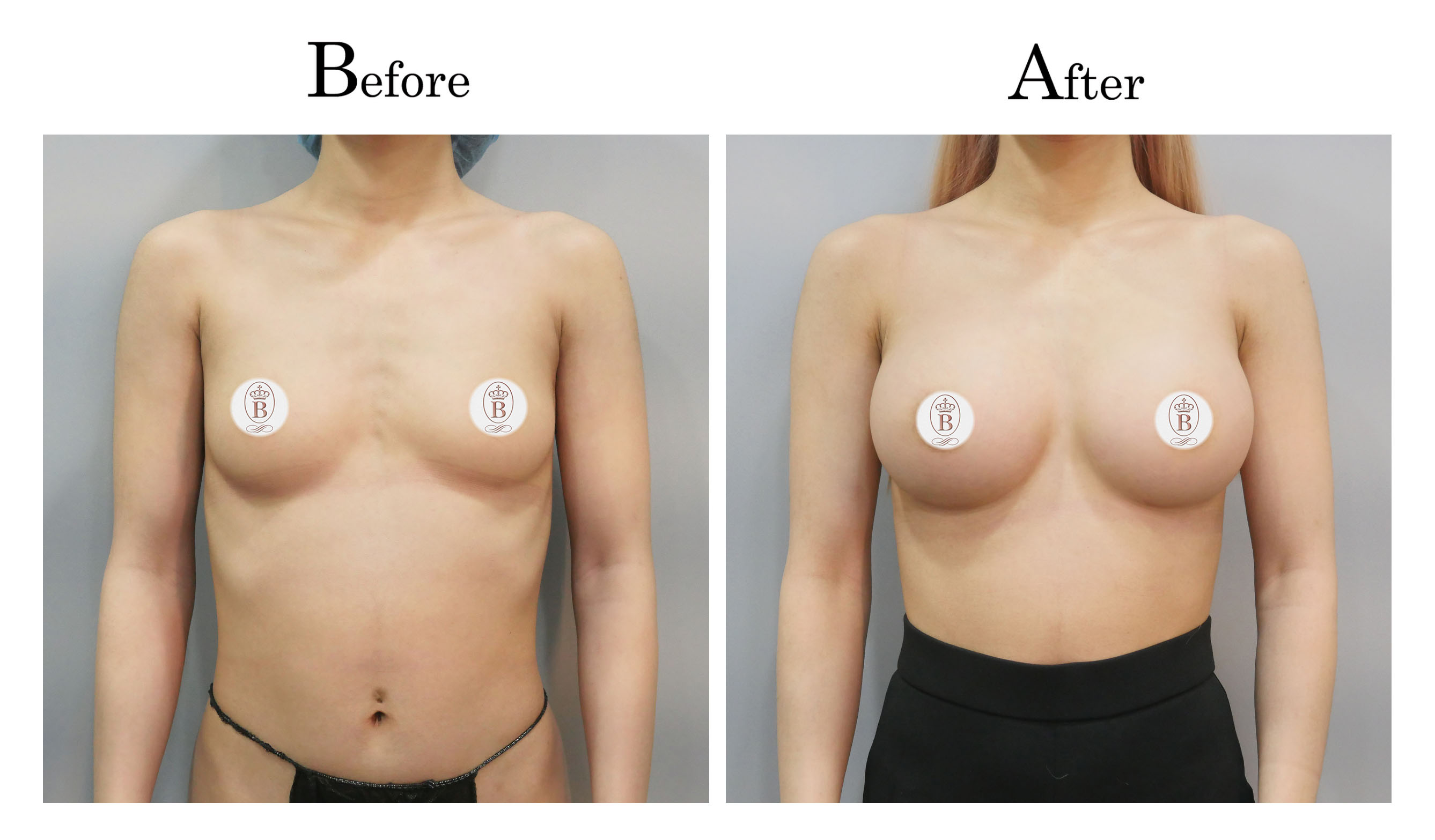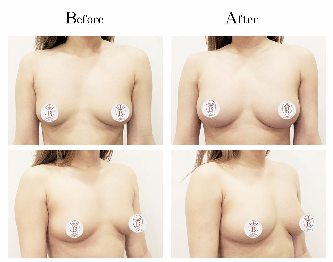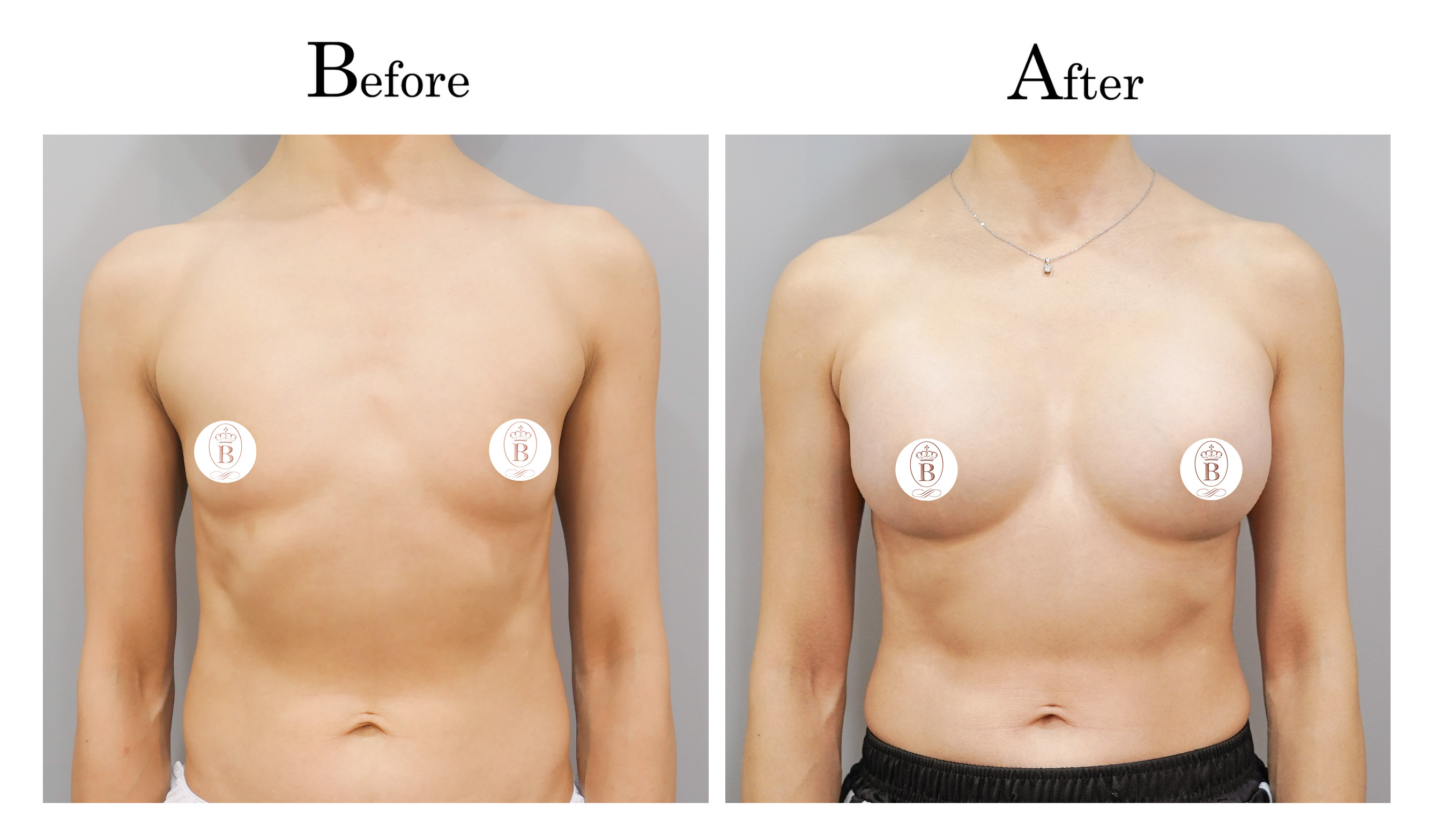 此案例的上胸與胸側較沒有肉、扁平甚至是凹陷,胸型反而有下垂的錯覺,但皮膚下有足夠的空間注射多量脂肪,因此醫師抽取腰腹的健康脂肪,將之移植至上胸、胸側原本不足之處,即此由B躍升至D罩杯,另外由於用的是自體脂肪,沒有異體物排斥的問題,只待穩定過後存活下來的脂肪即能永久存活,相當適合排斥異體植入或擔心莢膜攣縮的受術者。