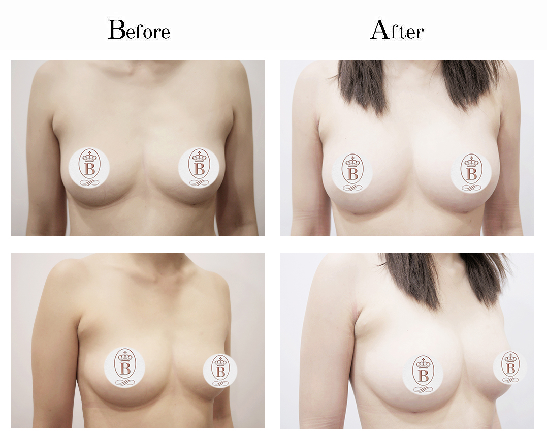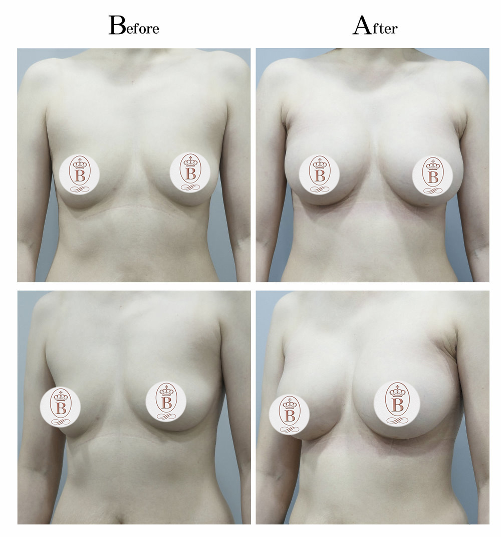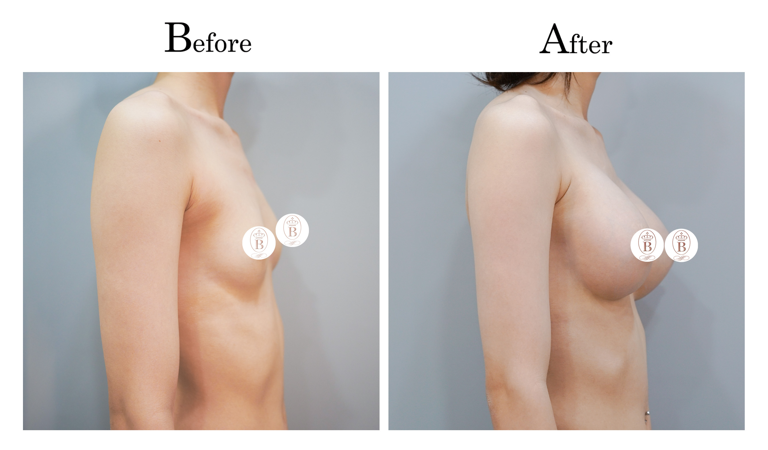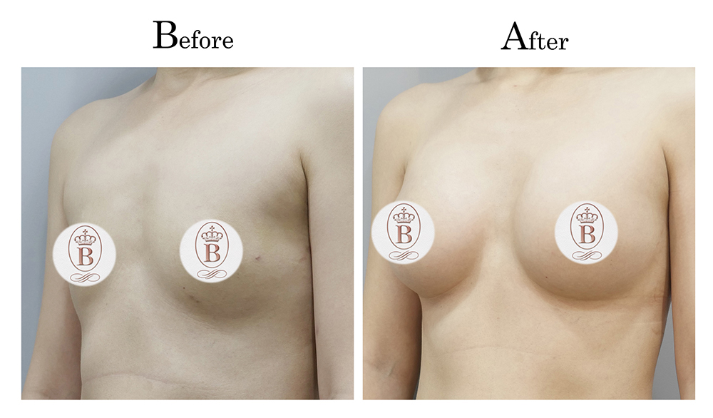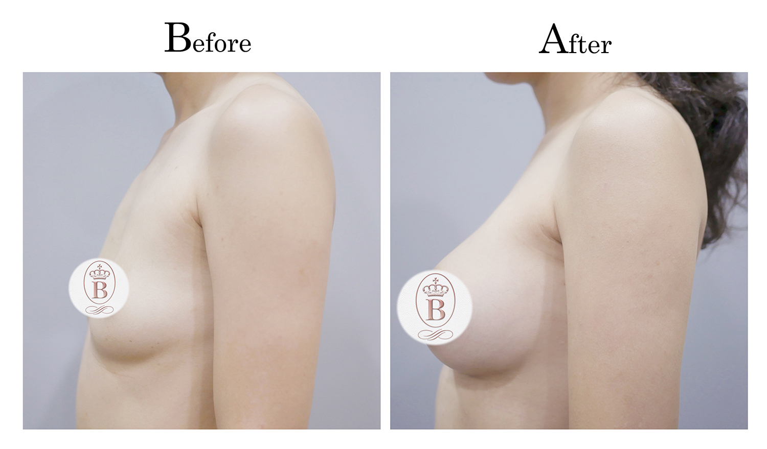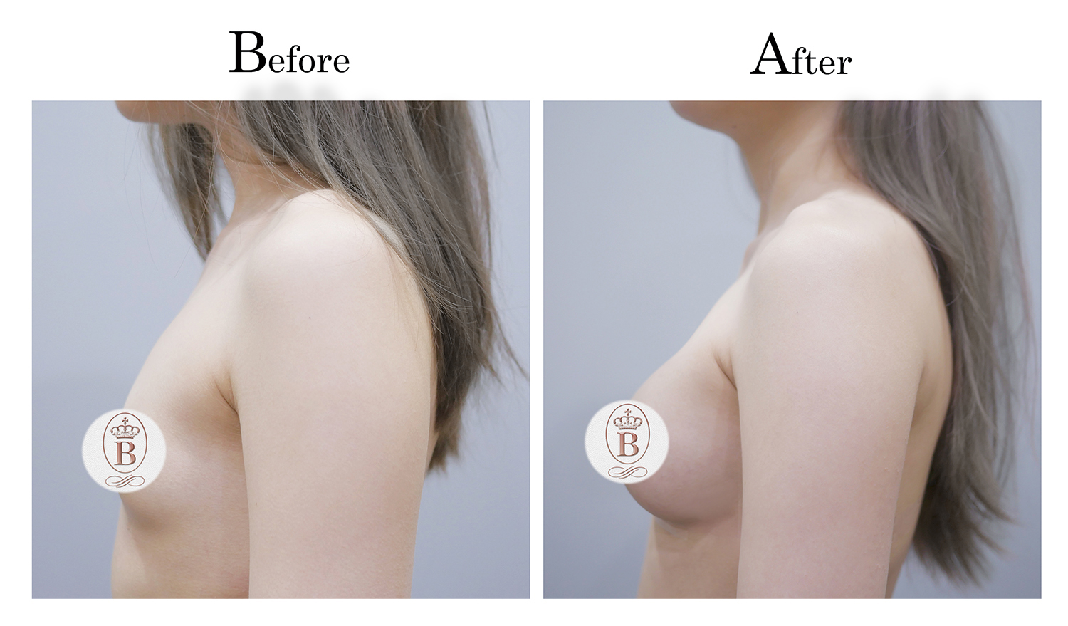 此案例的上胸與胸側較沒有肉、扁平甚至是凹陷,胸型反而有下垂的錯覺,但皮膚下有足夠的空間注射多量脂肪,因此醫師抽取腰腹的健康脂肪,將之移植至上胸、胸側原本不足之處,即此由B躍升至D罩杯,另外由於用的是自體脂肪,沒有異體物排斥的問題,只待穩定過後存活下來的脂肪即能永久存活,相當適合排斥異體植入或擔心莢膜攣縮的受術者。
