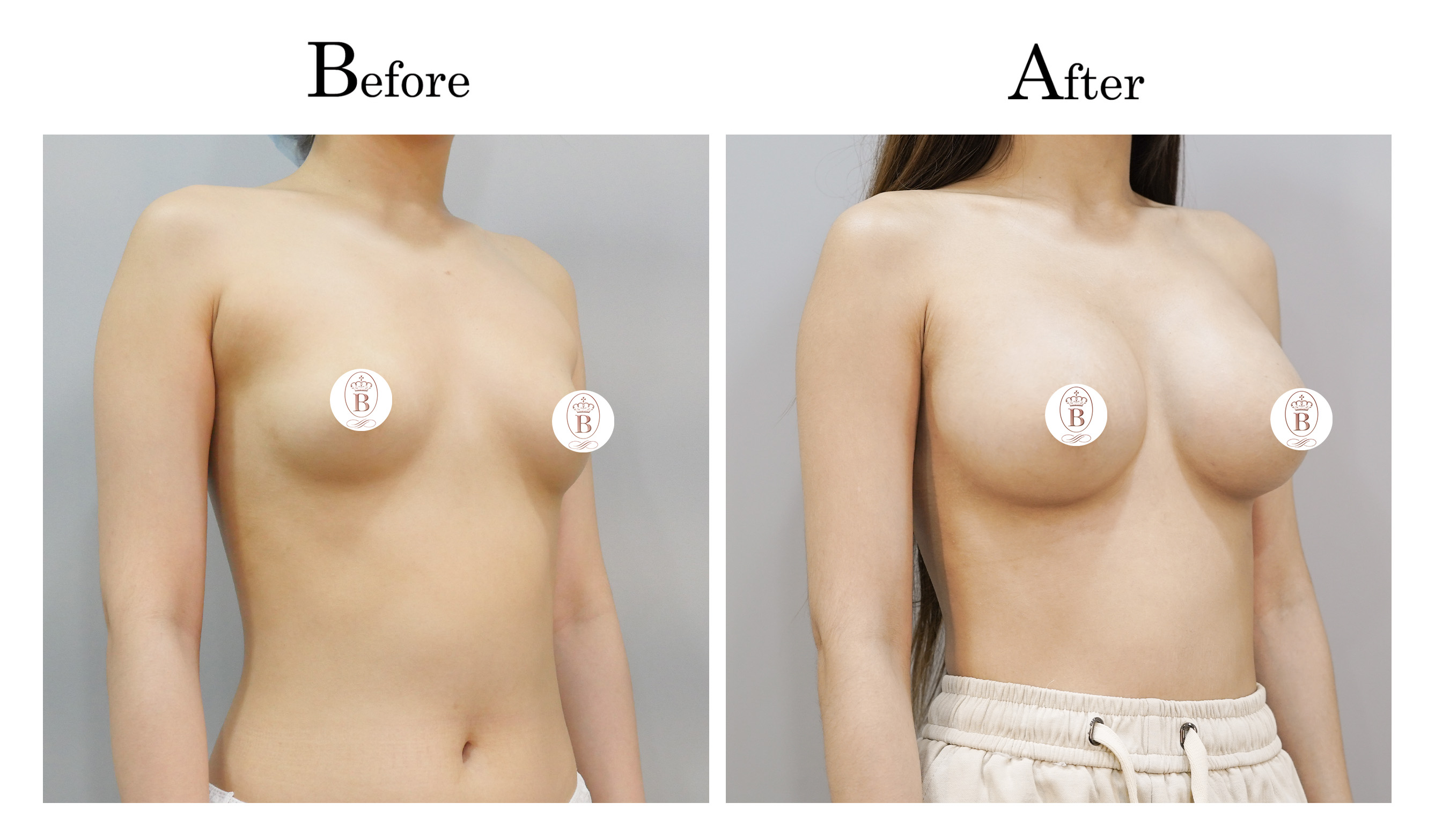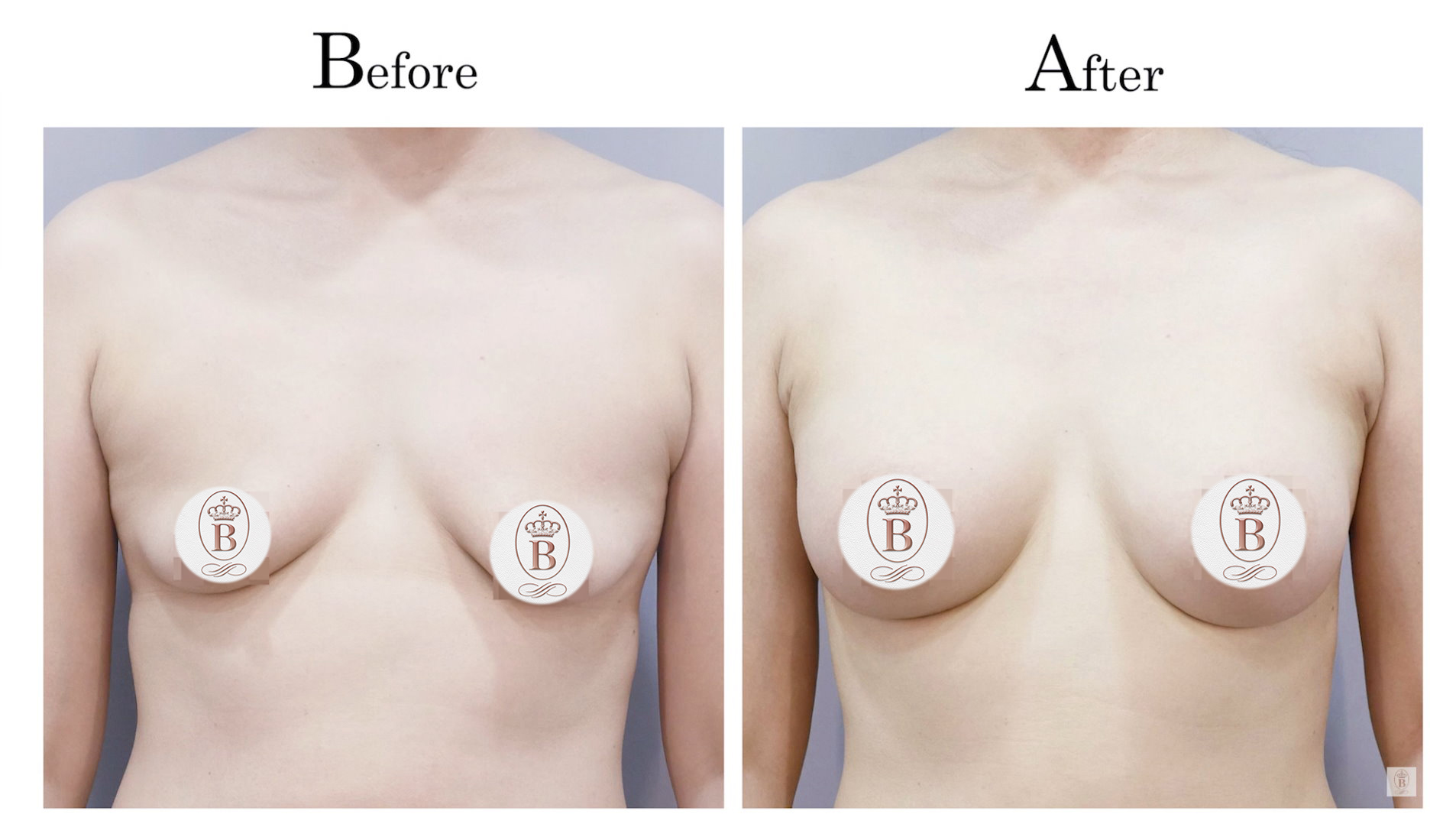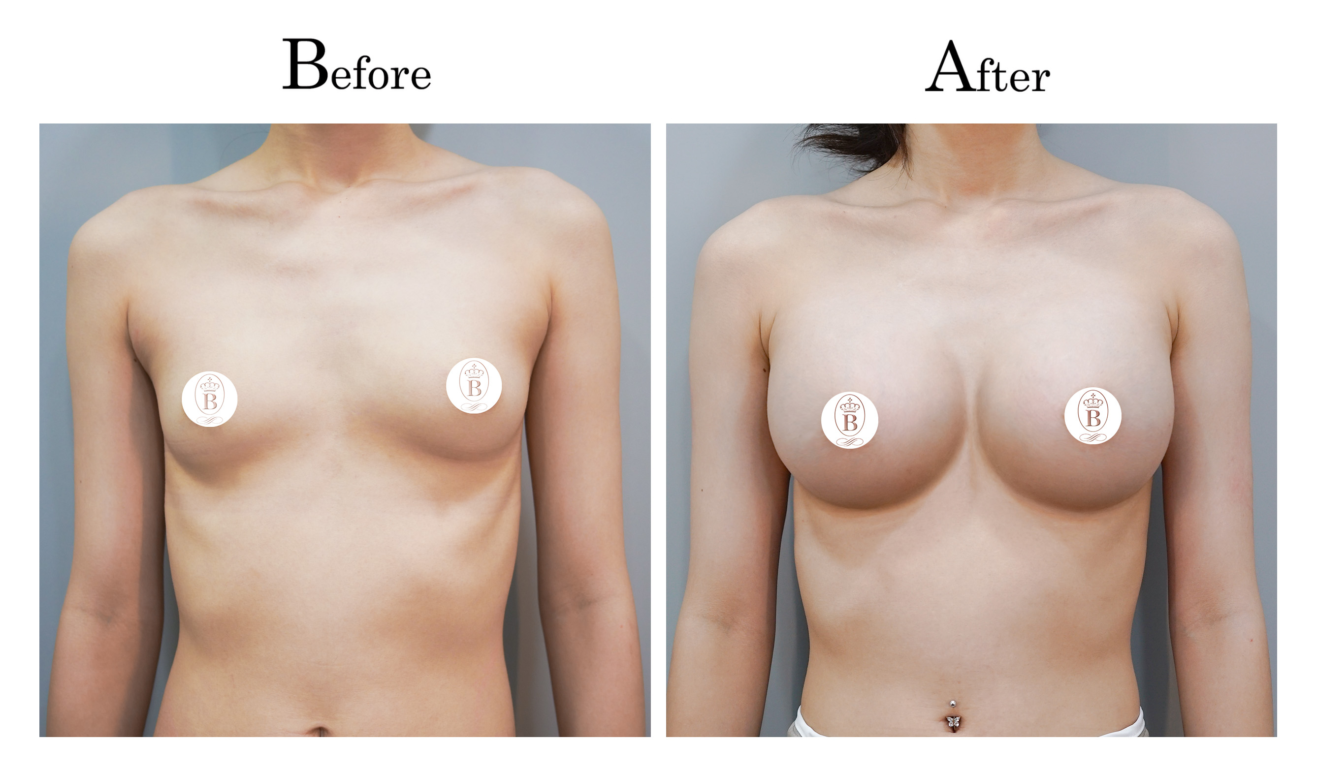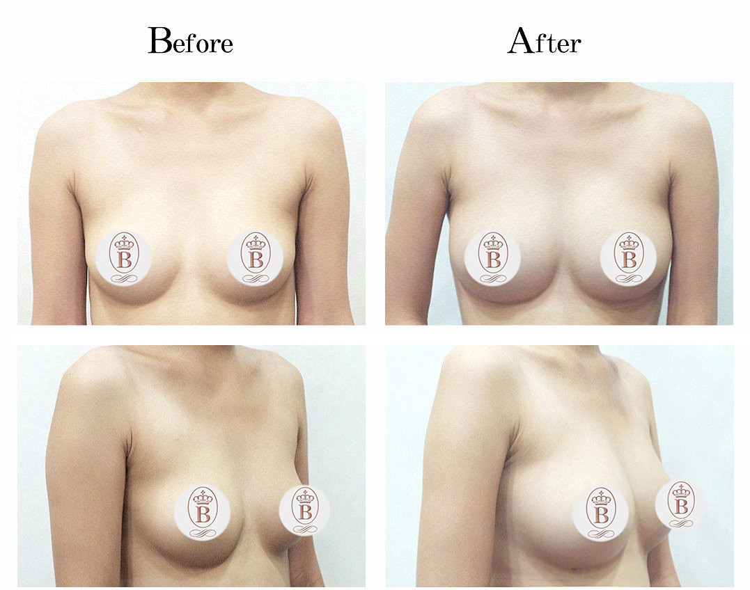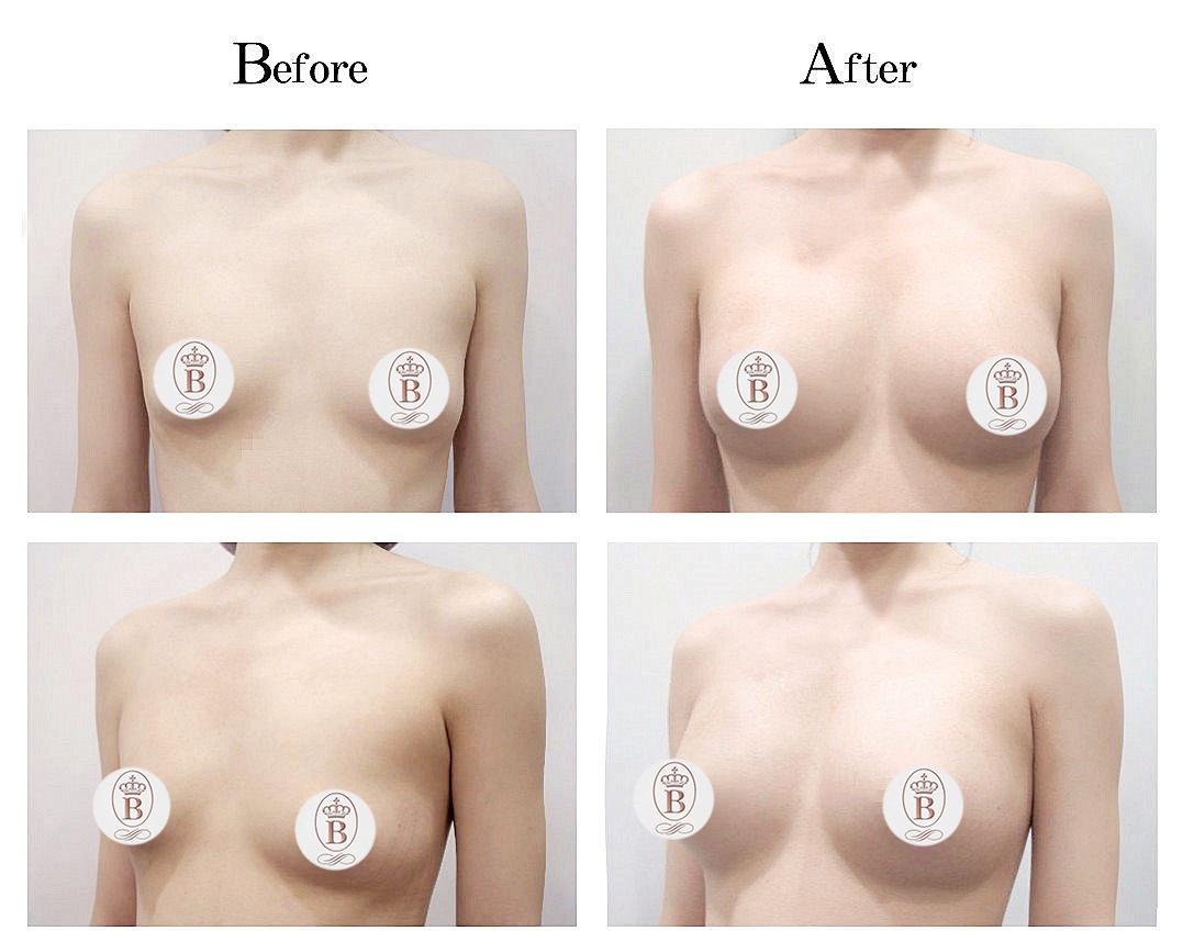 此案例的上胸與胸側較沒有肉、扁平甚至是凹陷,胸型反而有下垂的錯覺,但皮膚下有足夠的空間注射多量脂肪,因此醫師抽取腰腹的健康脂肪,將之移植至上胸、胸側原本不足之處,即此由B躍升至D罩杯,另外由於用的是自體脂肪,沒有異體物排斥的問題,只待穩定過後存活下來的脂肪即能永久存活,相當適合排斥異體植入或擔心莢膜攣縮的受術者。