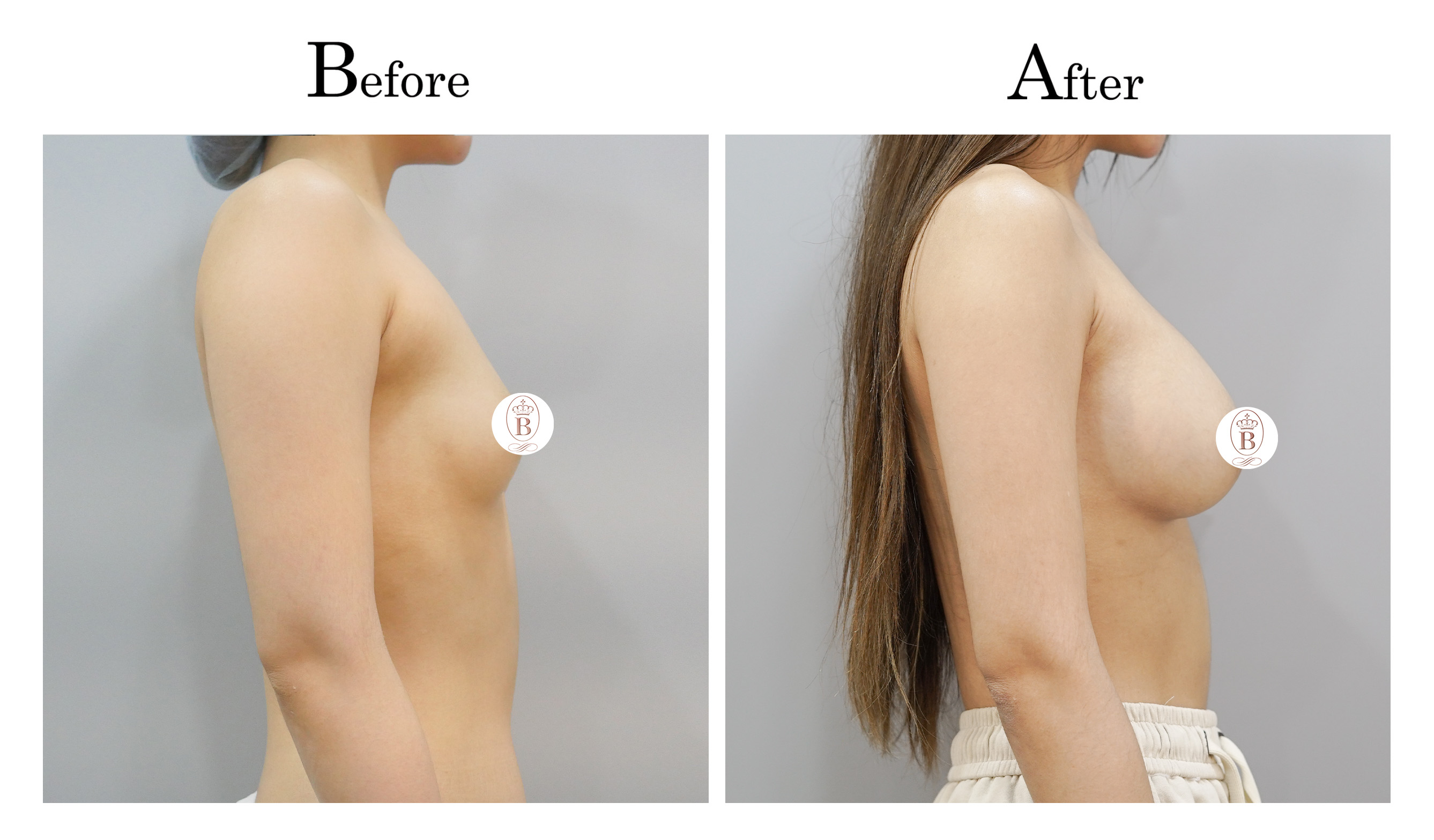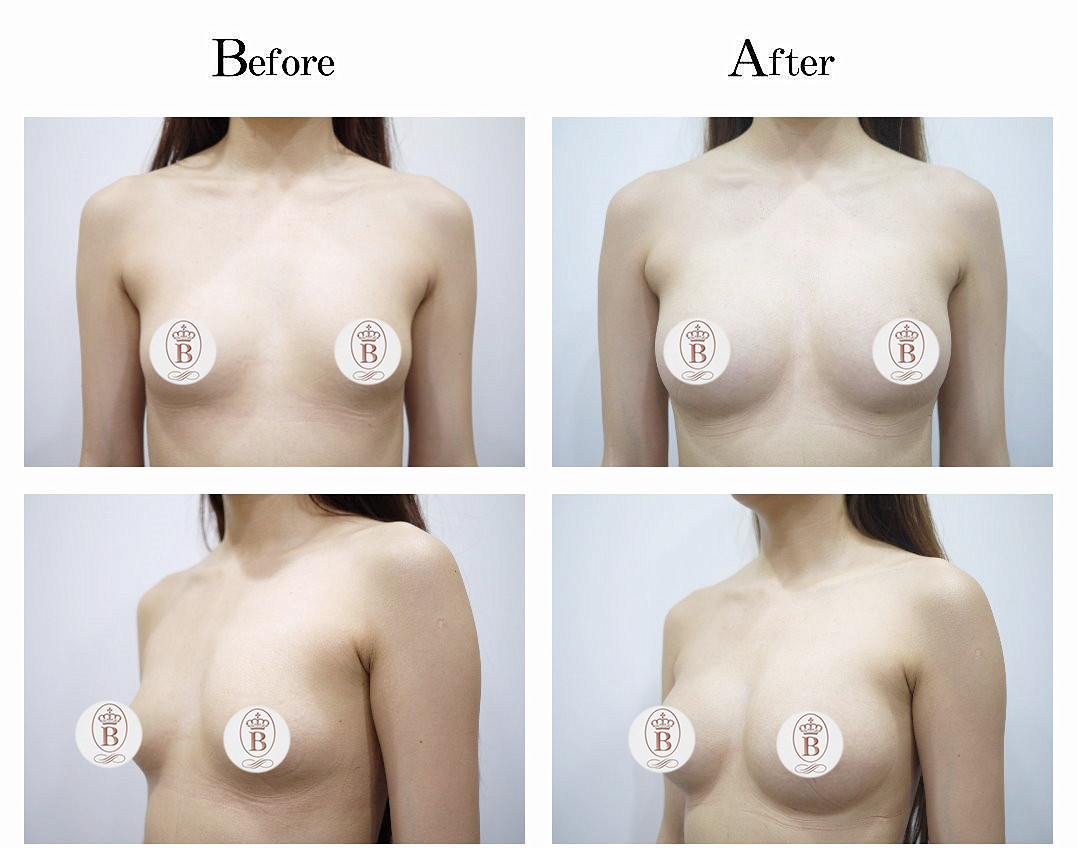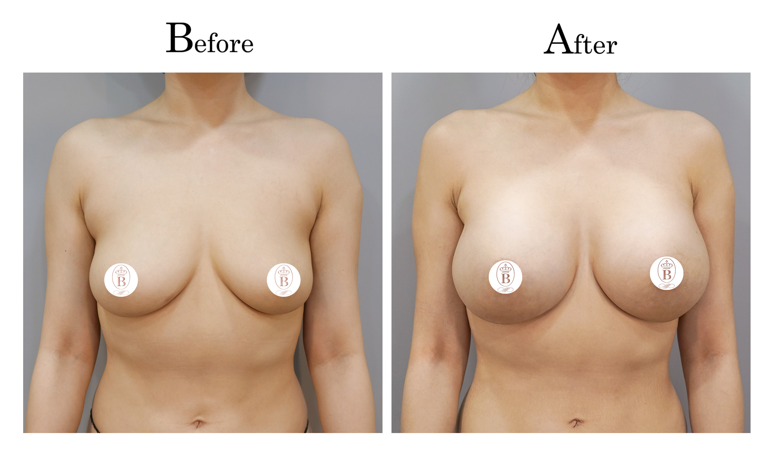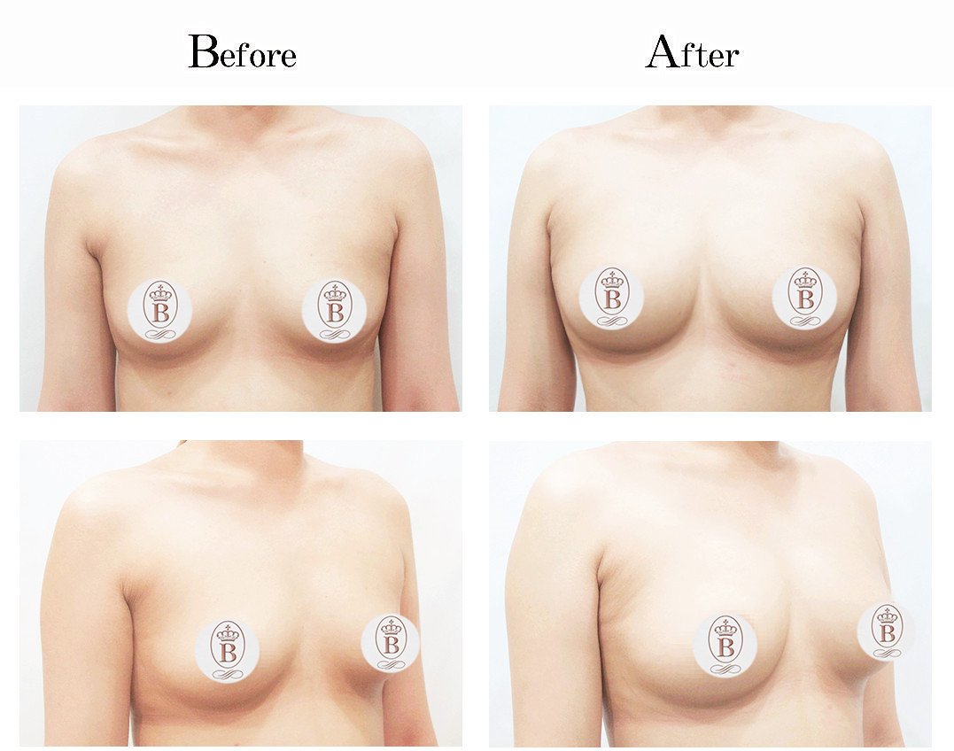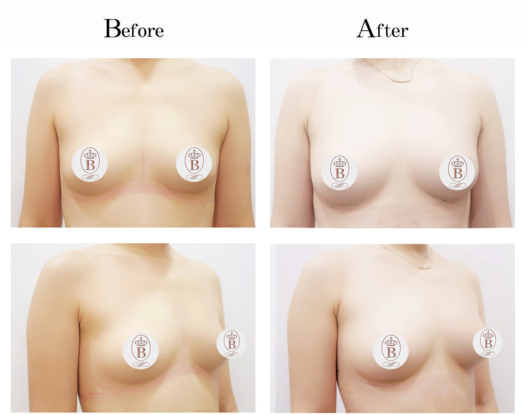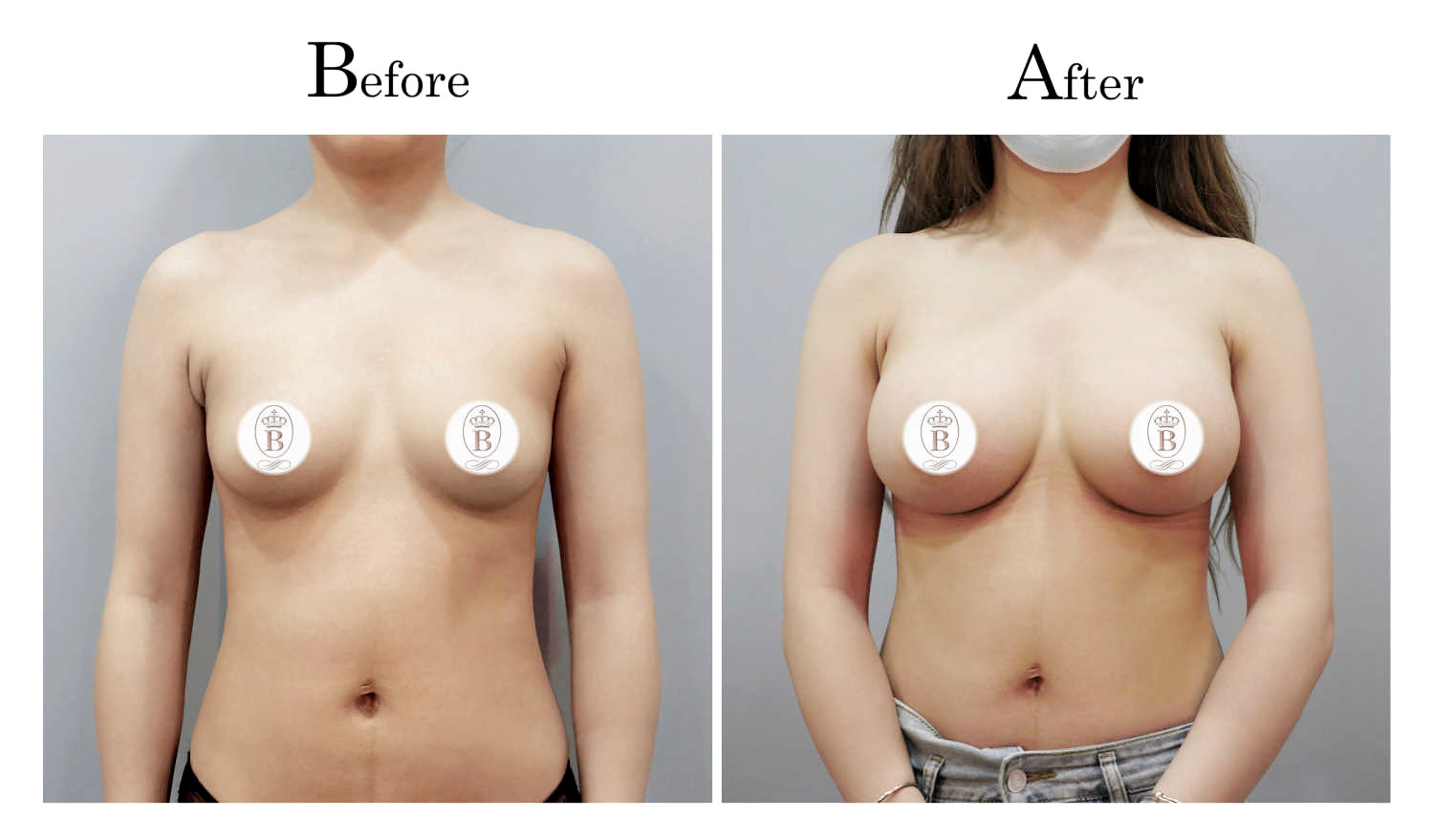 此案例的上胸與胸側較沒有肉、扁平甚至是凹陷,胸型反而有下垂的錯覺,但皮膚下有足夠的空間注射多量脂肪,因此醫師抽取腰腹的健康脂肪,將之移植至上胸、胸側原本不足之處,即此由B躍升至D罩杯,另外由於用的是自體脂肪,沒有異體物排斥的問題,只待穩定過後存活下來的脂肪即能永久存活,相當適合排斥異體植入或擔心莢膜攣縮的受術者。