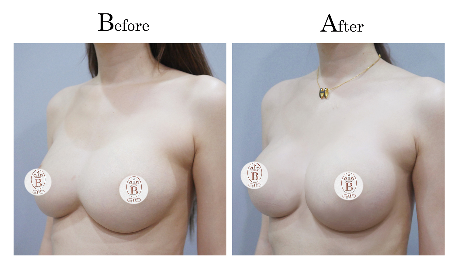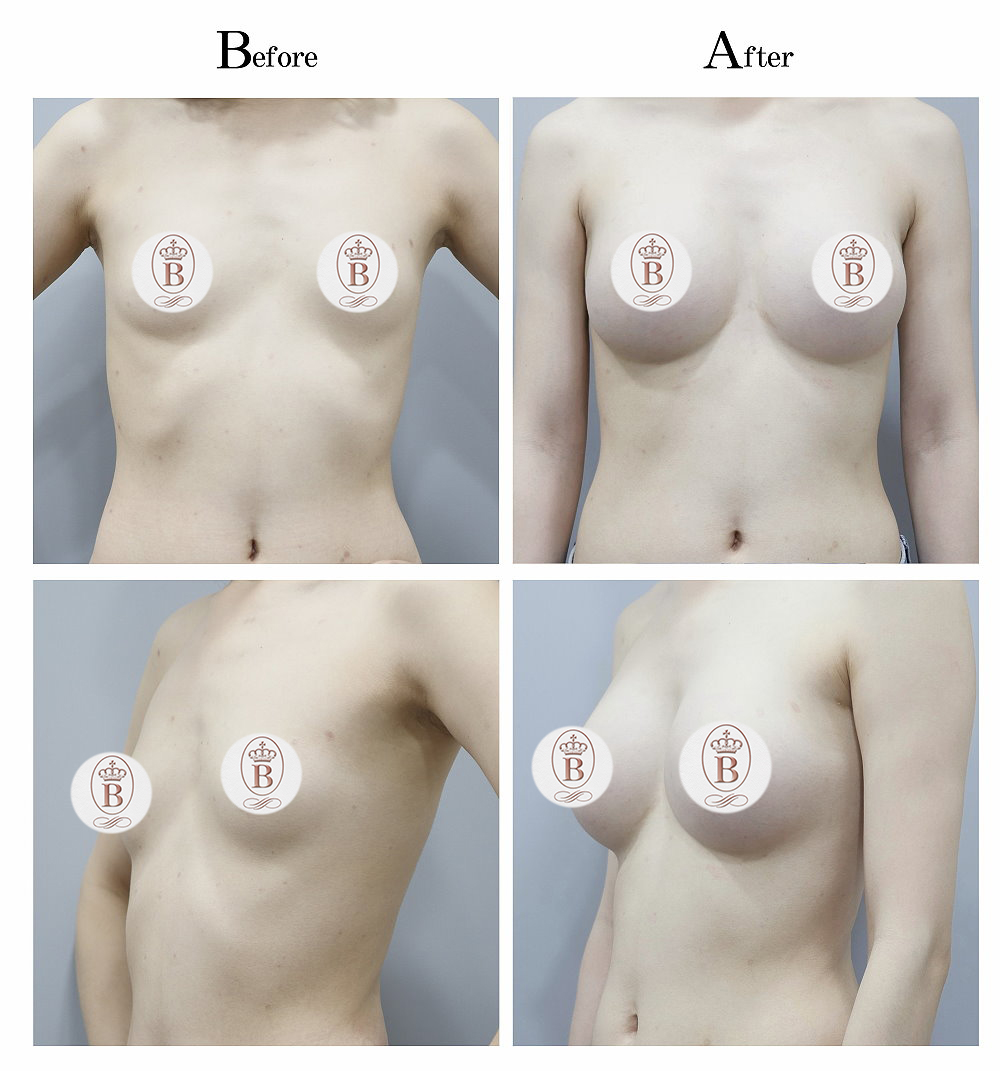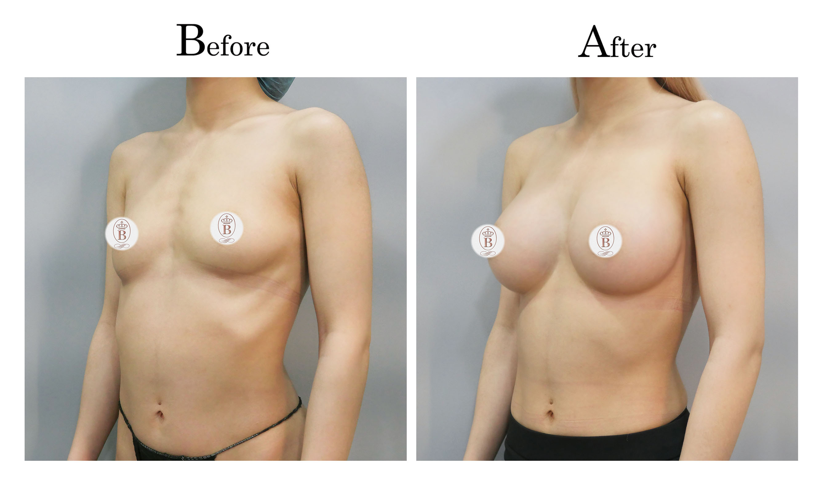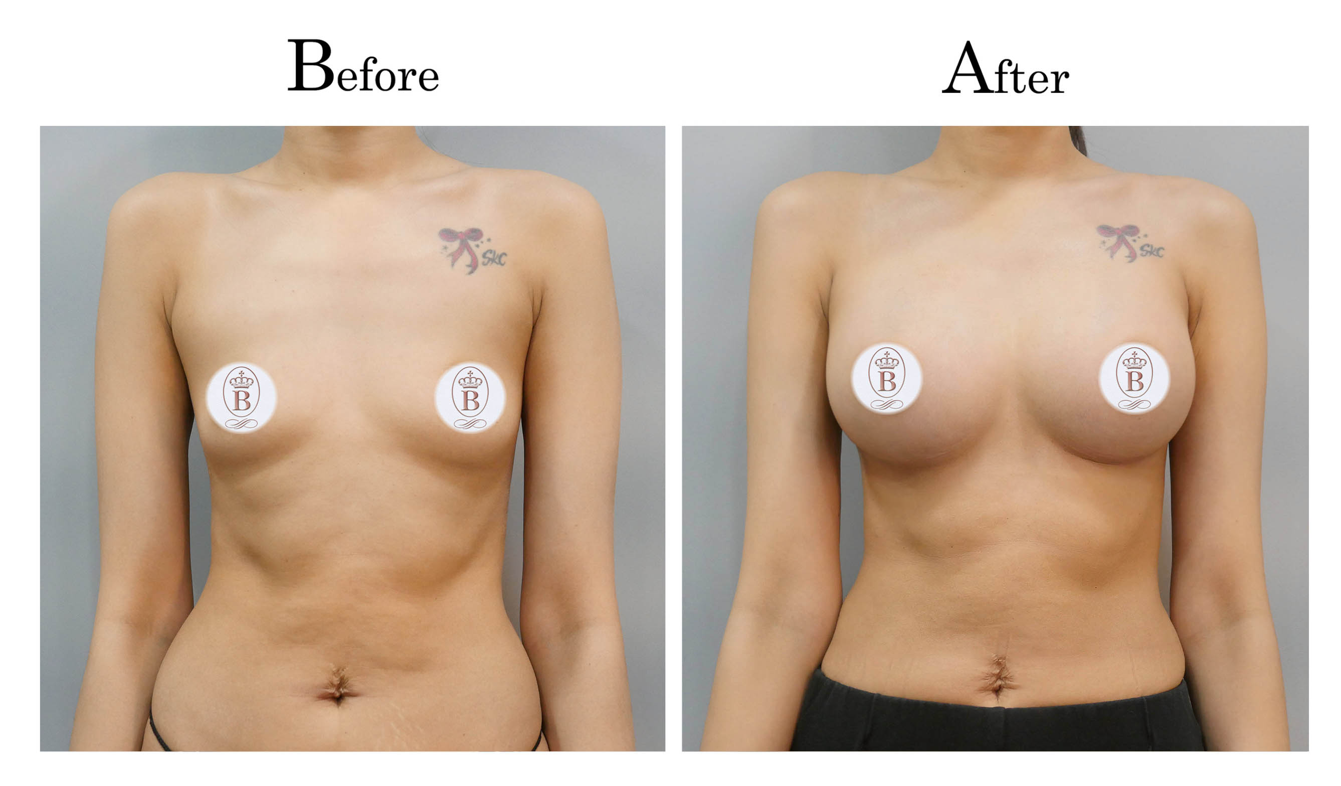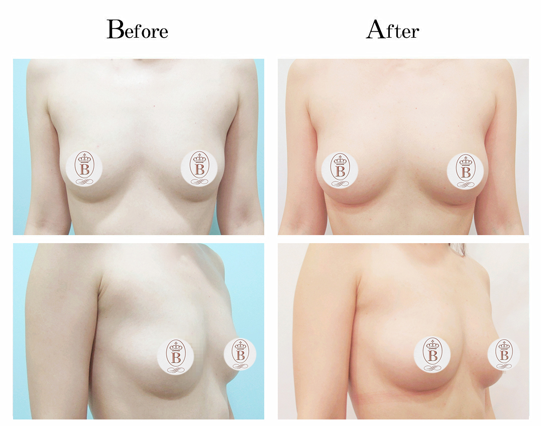 此案例的上胸與胸側較沒有肉、扁平甚至是凹陷,胸型反而有下垂的錯覺,但皮膚下有足夠的空間注射多量脂肪,因此醫師抽取腰腹的健康脂肪,將之移植至上胸、胸側原本不足之處,即此由B躍升至D罩杯,另外由於用的是自體脂肪,沒有異體物排斥的問題,只待穩定過後存活下來的脂肪即能永久存活,相當適合排斥異體植入或擔心莢膜攣縮的受術者。