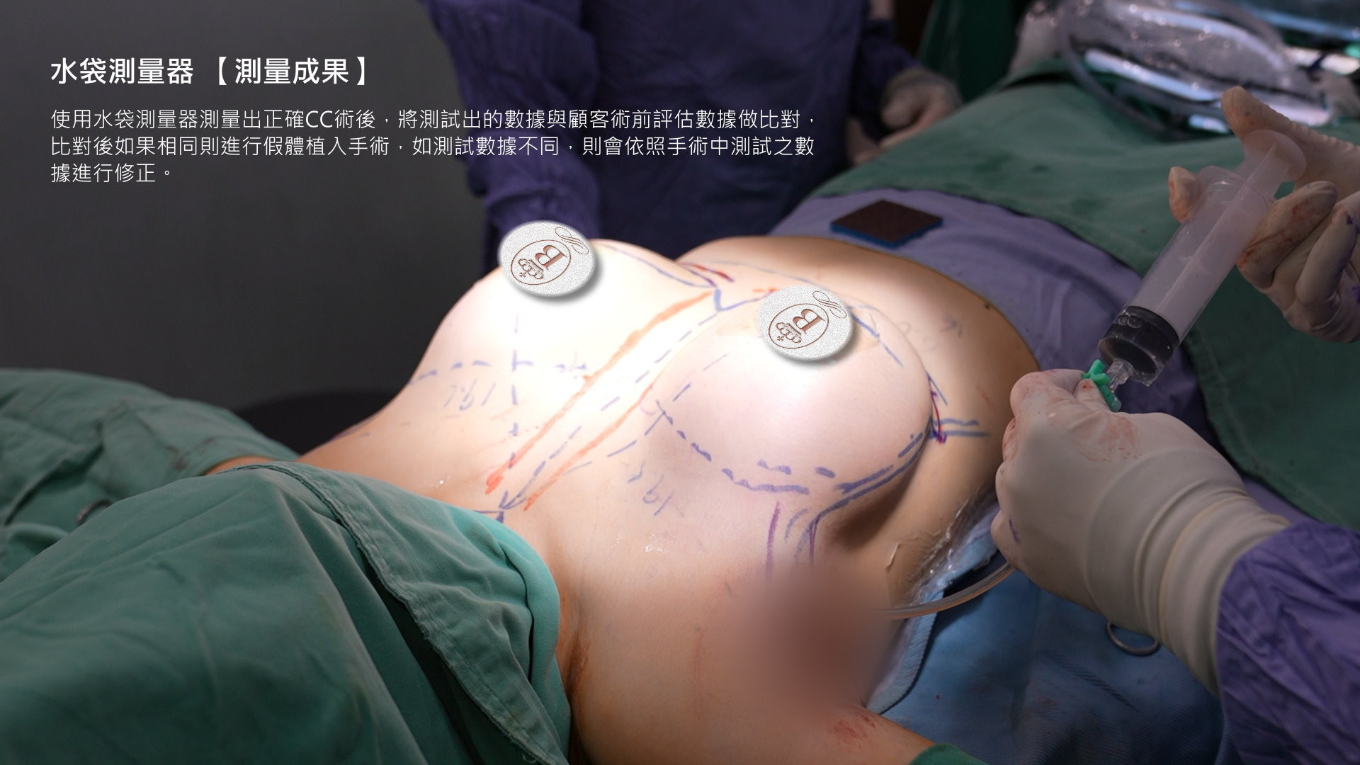 使用水袋測量器測量出正確CC術後,將測試出的數據與顧客術前評估數據做比對,比對後如果相同則進行隆乳假體植入手術,如測試數據不同,則會依照隆乳手術中測試之數據進行修正。