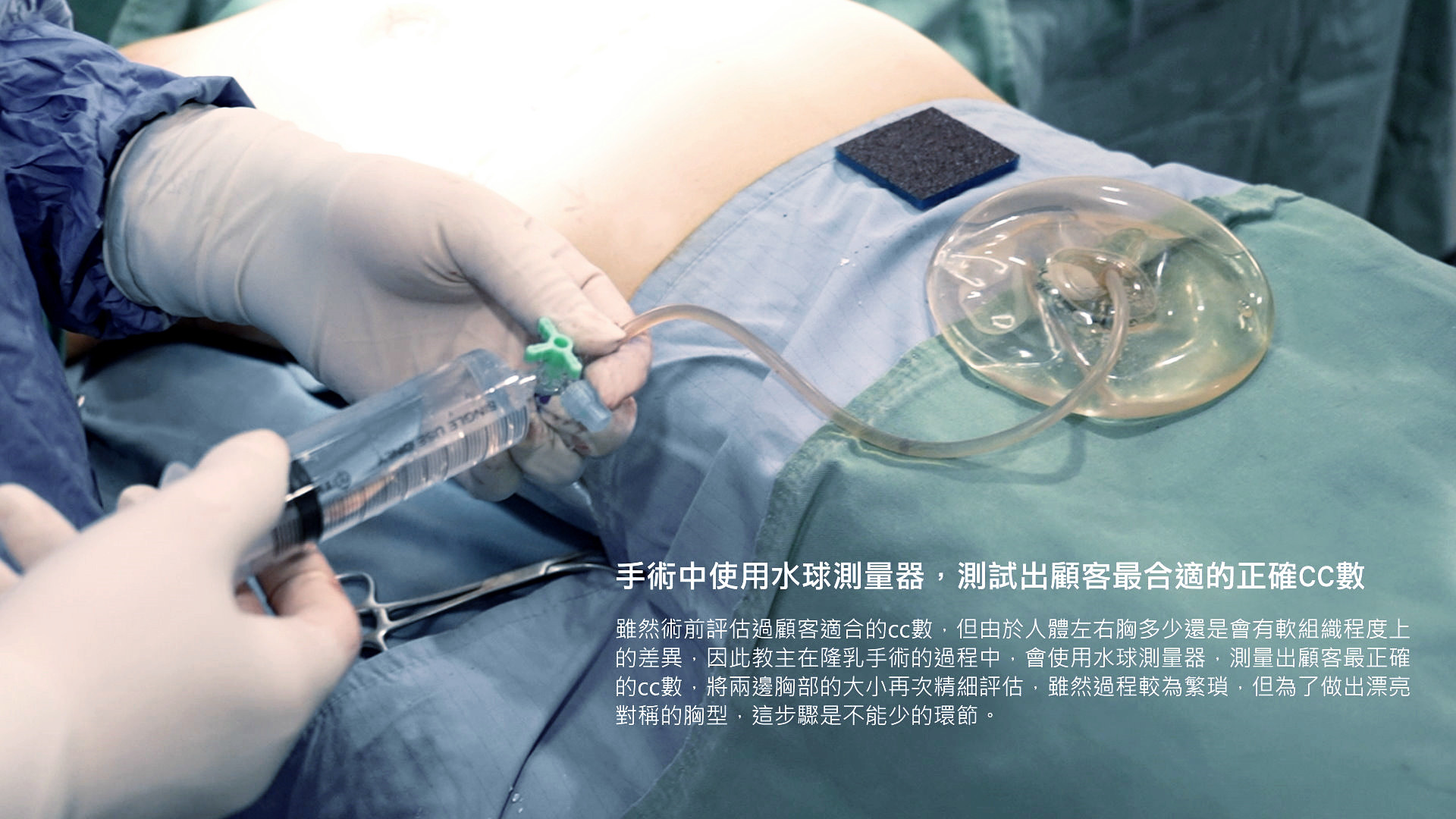 雖然術前評估過顧客適合的cc數,但由於人體左右胸多少還是會有軟組織程度上的差異,因此教主在隆乳手術的過程中,會使用水球測量器,測量出顧客最正確的cc數,將兩邊胸部的大小再次精細評估,雖然過程較為繁瑣,但為了做出漂亮對稱的胸型,這步驟是不能少的環節。