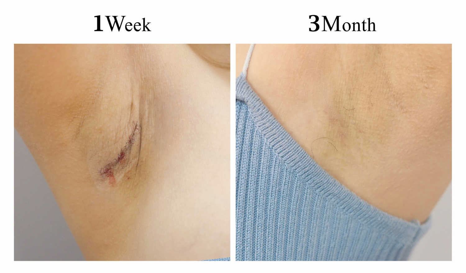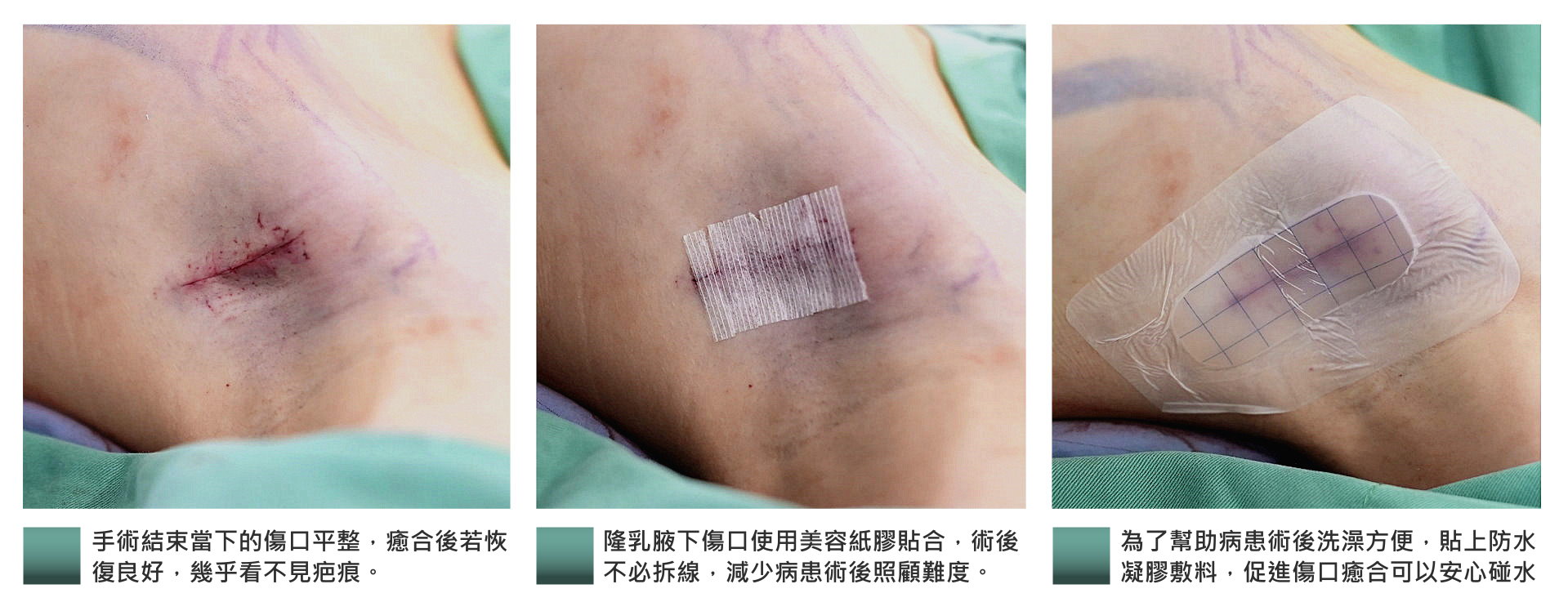 ▊隆乳腋下傷口使用美容紙膠貼合,術後不必拆線,減少病患術後照顧難度。