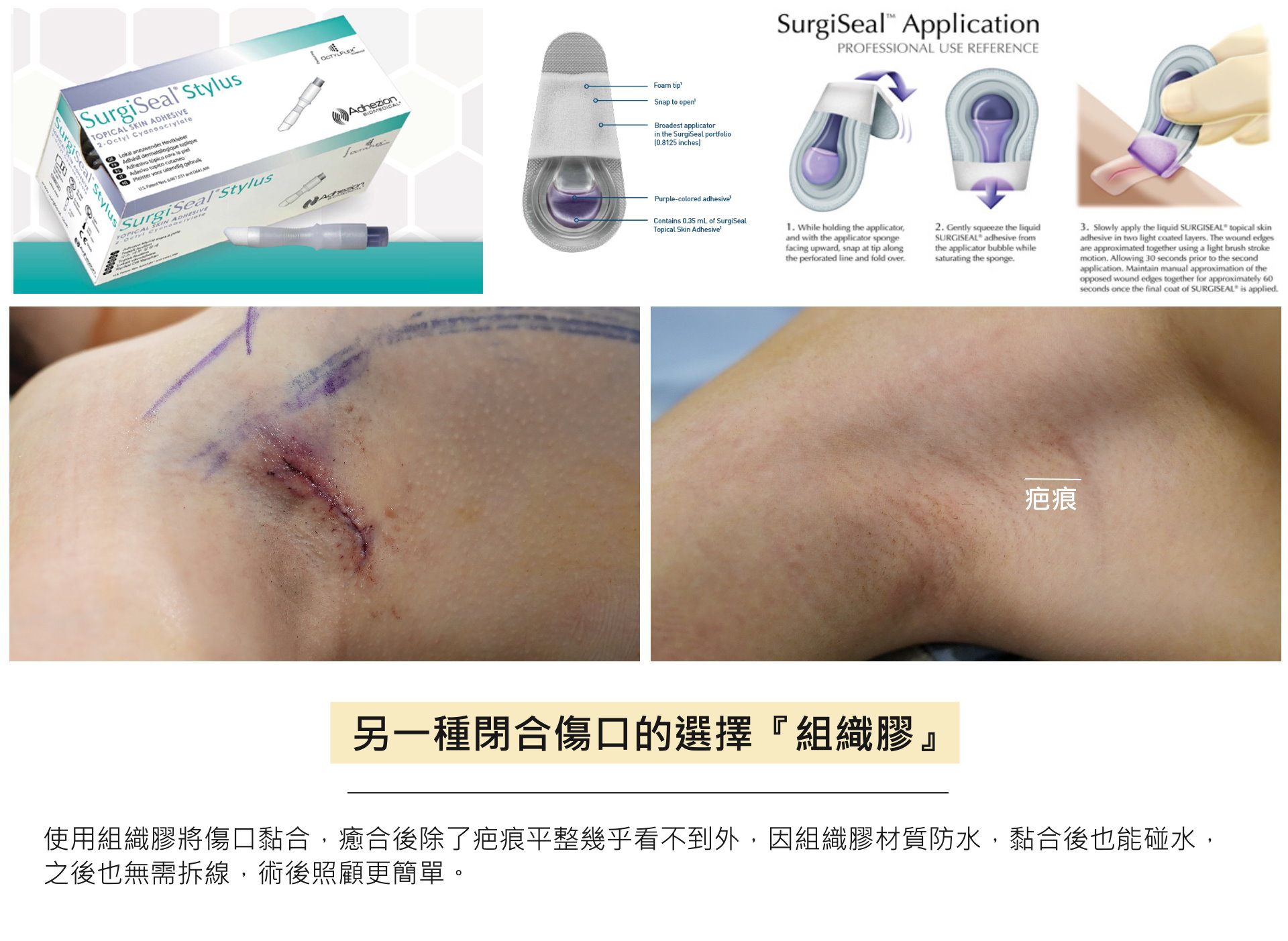 使用組織膠將傷口黏合,癒合後除了疤痕平整幾乎看不到外,因組織膠材質防水,黏合後也能碰水,之後也無需拆線,術後照顧更簡單。