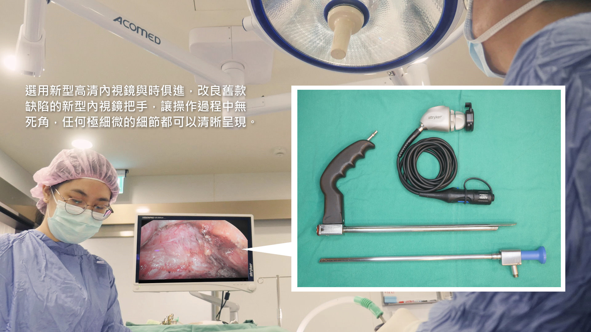 選用新型高清內視鏡與時俱進,改良舊款缺陷的新型內視鏡把手,讓操作過程中無死角,任何極細微的細節都可以清晰呈現。