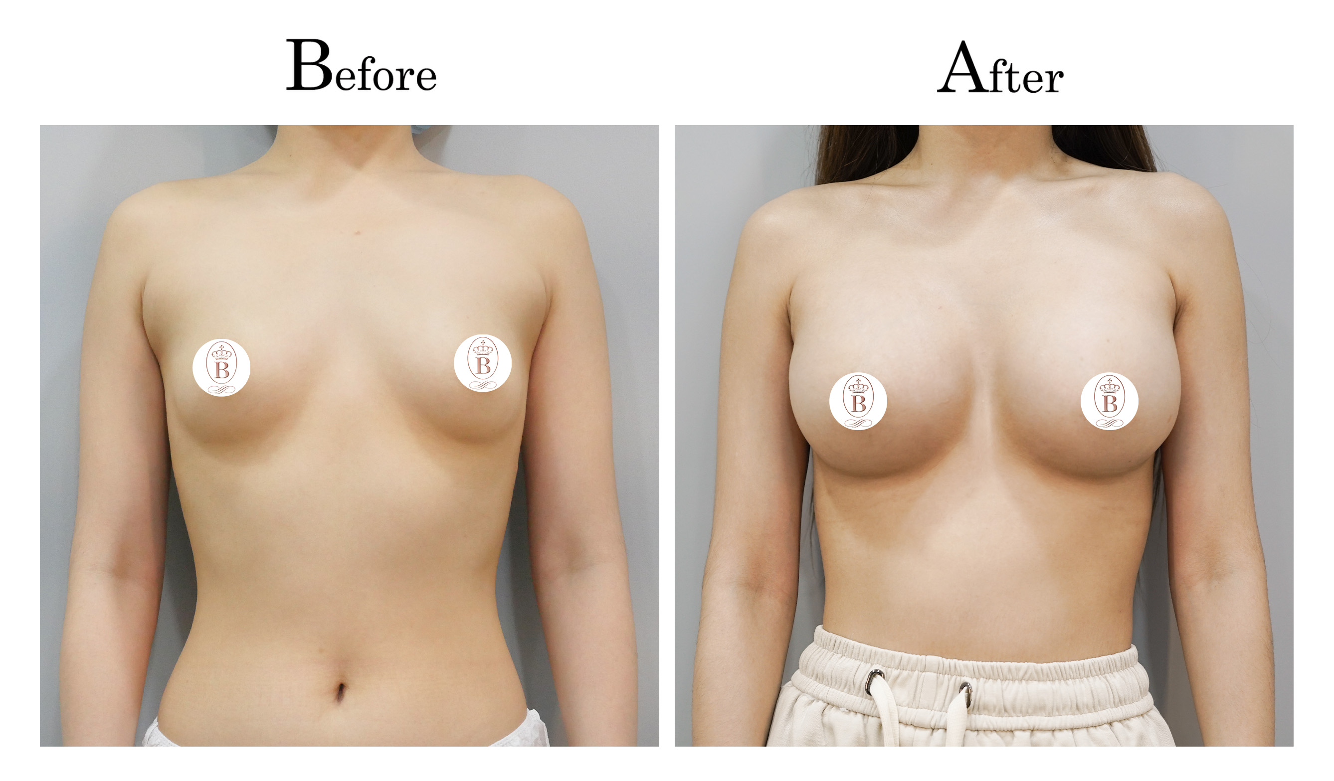 此案例本身因為產後造成乳房萎縮,外觀看起來乳房塌陷,產後萎縮的狀況,可選擇自體脂肪隆乳或假體矽膠隆乳來改善問題,自體脂肪因為有吸收率的問題,可能會須進行二次手術,此病患希望能夠一次性解決問題,所以選用假體矽膠隆乳來改善萎縮的問題,其本身對術後效果相當滿意。